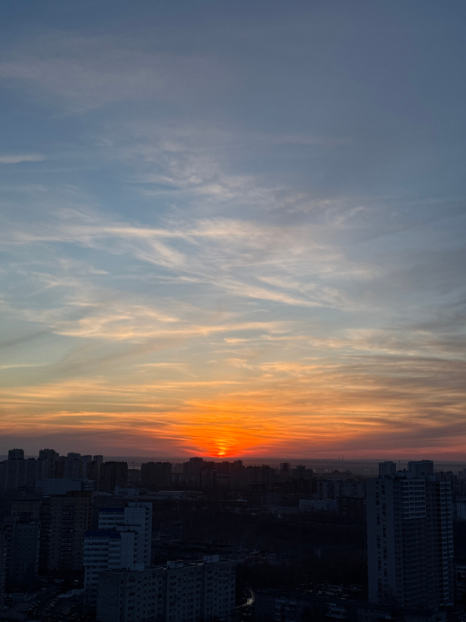 An aerial photograph captures a wide urban panorama of Perm, Russia, at either sunrise or sunset. The lower third of the image displays a dense cityscape, primarily composed of multi-story residential…read more