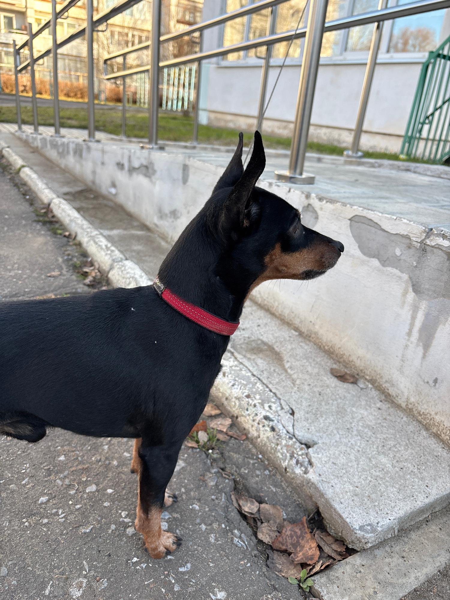 A black and tan Doberman Pinscher wearing a red collar stands on a gray concrete surface, likely a sidewalk or a paved area. The dog is positioned with its head tilted upwards and to the left, suggest…read more