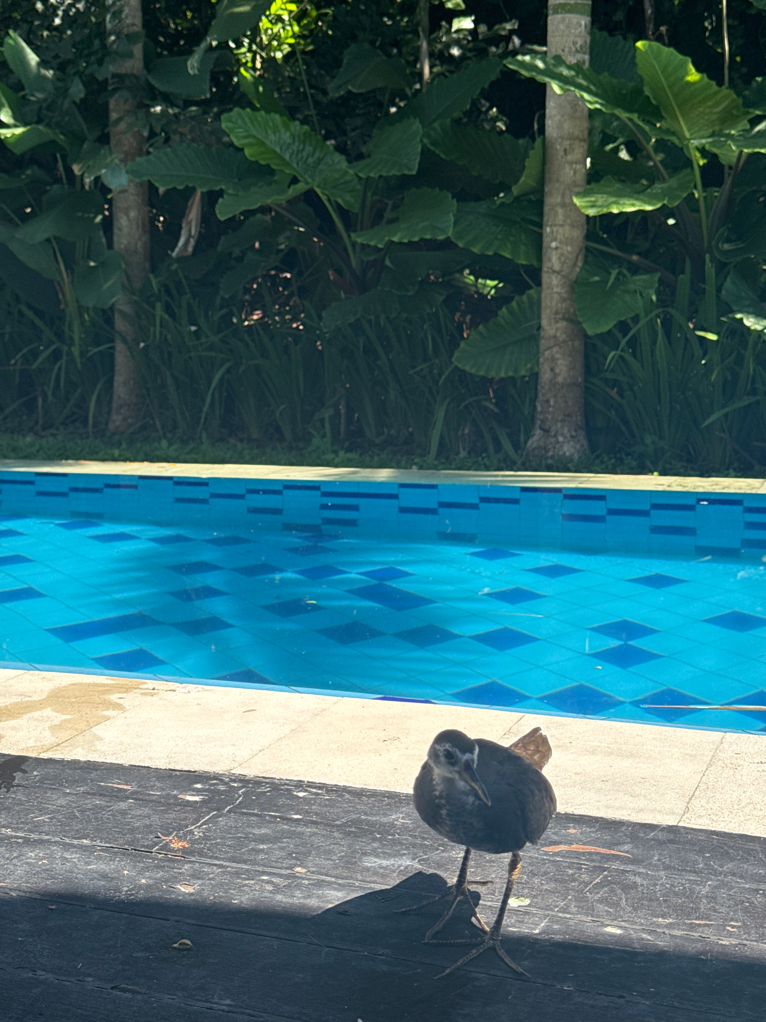 A dusky moorhen stands on a dark wooden deck beside a swimming pool in Kuta Selatan, Indonesia. The pool has blue and turquoise tiles. Lush greenery, including trees and large-leaved plants, is visibl…read more