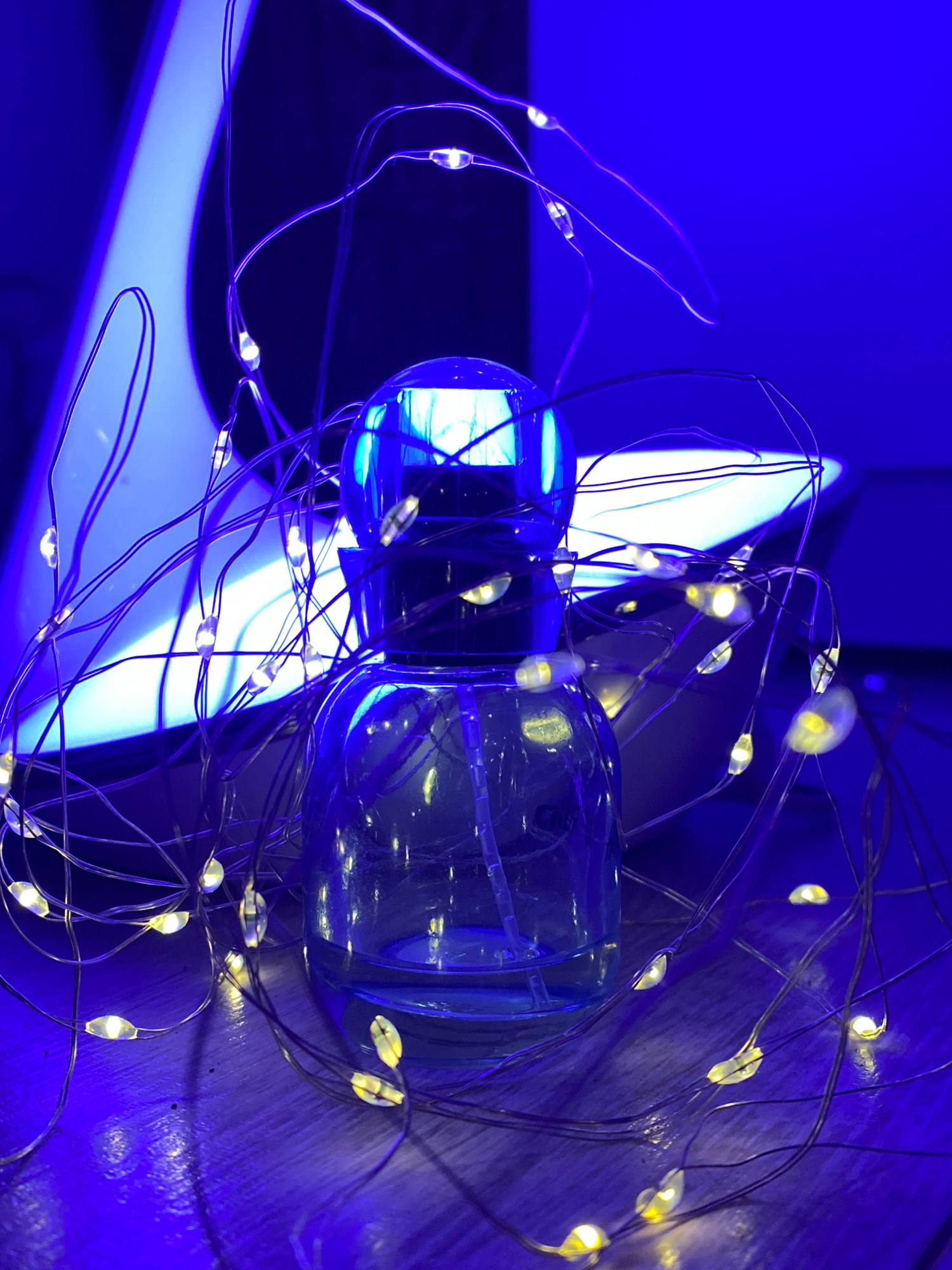 The image shows two glass jars connected, possibly by a glass tube, with copper wire lights wrapped around them. The lighting creates a blue hue on the objects and the background, which appears to be…read more