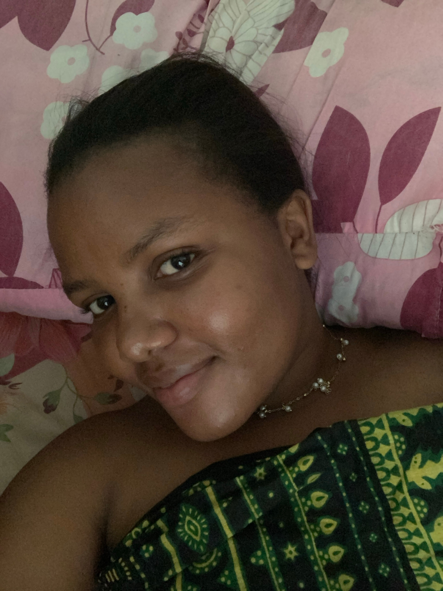 A young woman with dark hair and brown skin lies on her side on a bed with floral patterned bedding. She wears a delicate necklace with small pearls. Her head rests on a pink floral pillow. She is par…read more