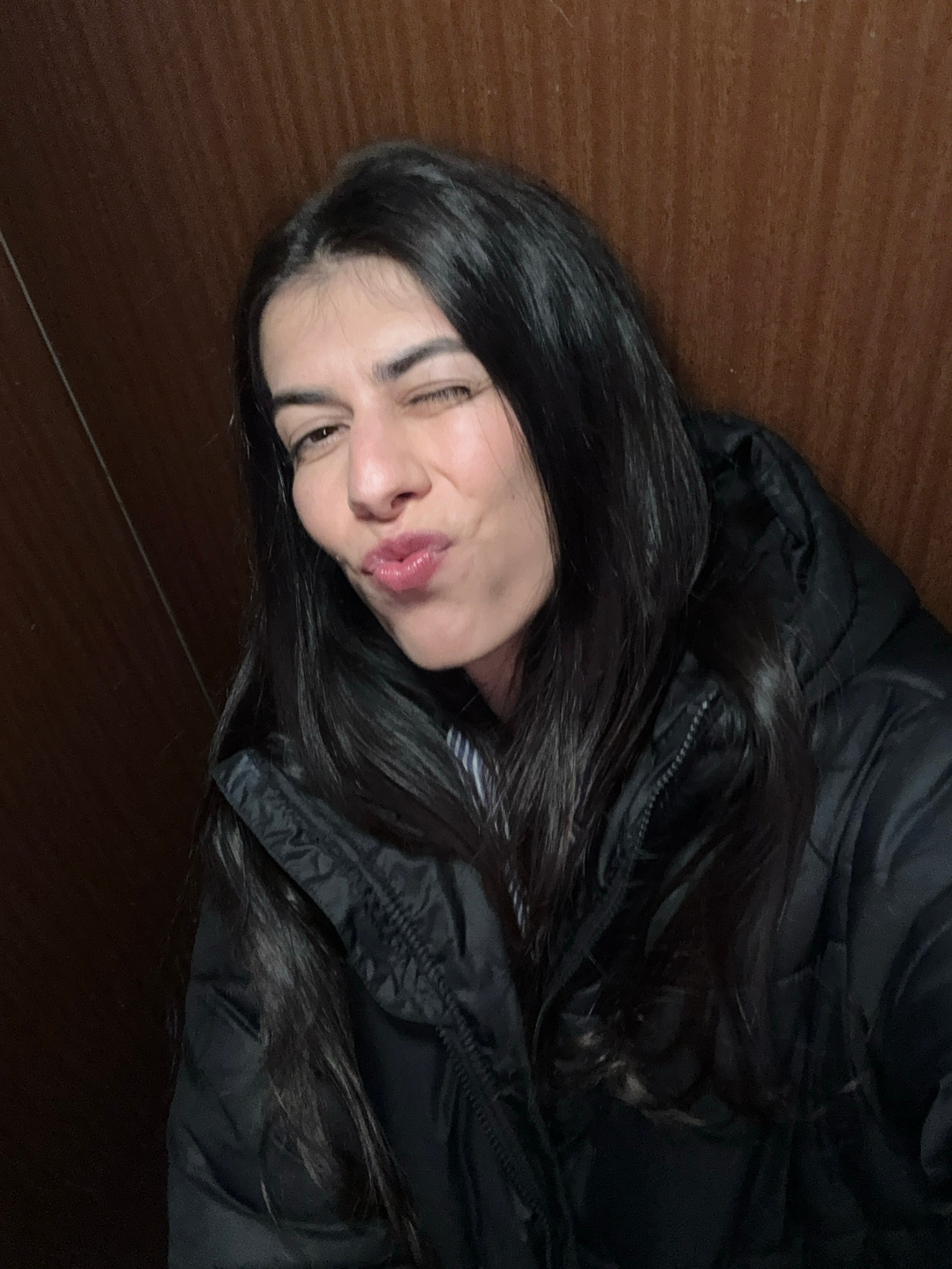 A young woman with dark hair is lying on a brown wooden surface, possibly a floor or wall. She is wearing a black, puffy jacket. The location is unknown, and the prompt to locate in Dimitrovgrad, Bulg…read more