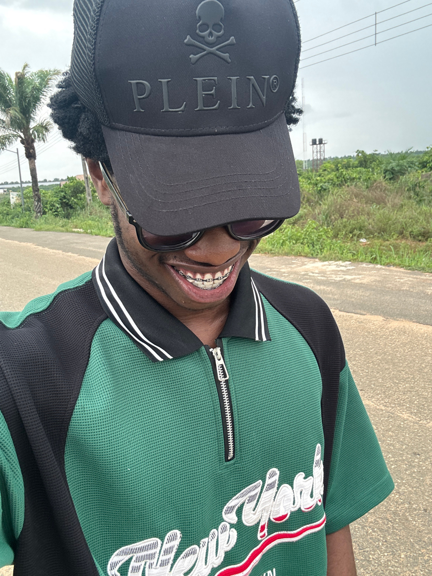 A close-up shot of a man wearing a black PLEIN baseball cap with a skull and crossbones logo, sunglasses, and braces. He's wearing a green and black zippered shirt with white and red embroidered lette…read more