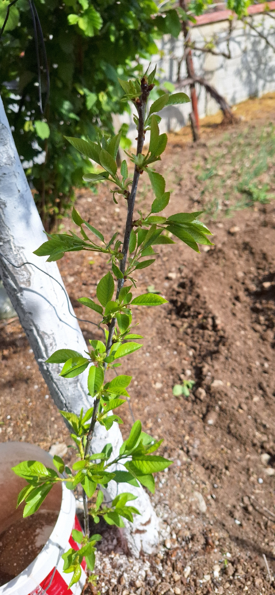 The image depicts a branch of a plant with green leaves against a background of soil, a white railing, and a white bucket with a red stripe. The scene is outdoors, with the plant appearing to be growiβ¦read more