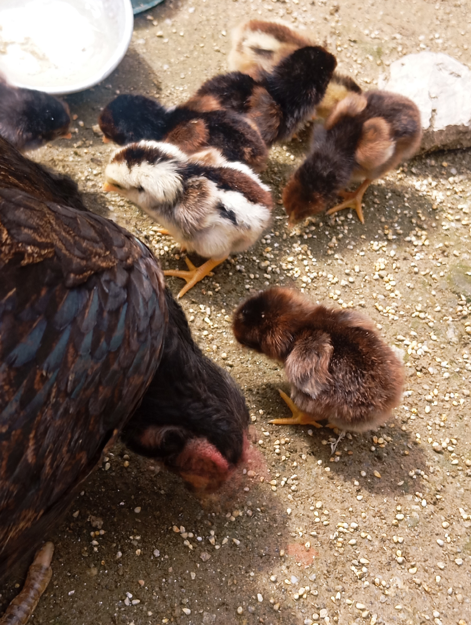 The image depicts a group of chicks with an adult hen in an outdoor environment. There are seven chicks visible, of varying colors: brown, black, and speckled with white and brown. The hen is dark broβ¦read more