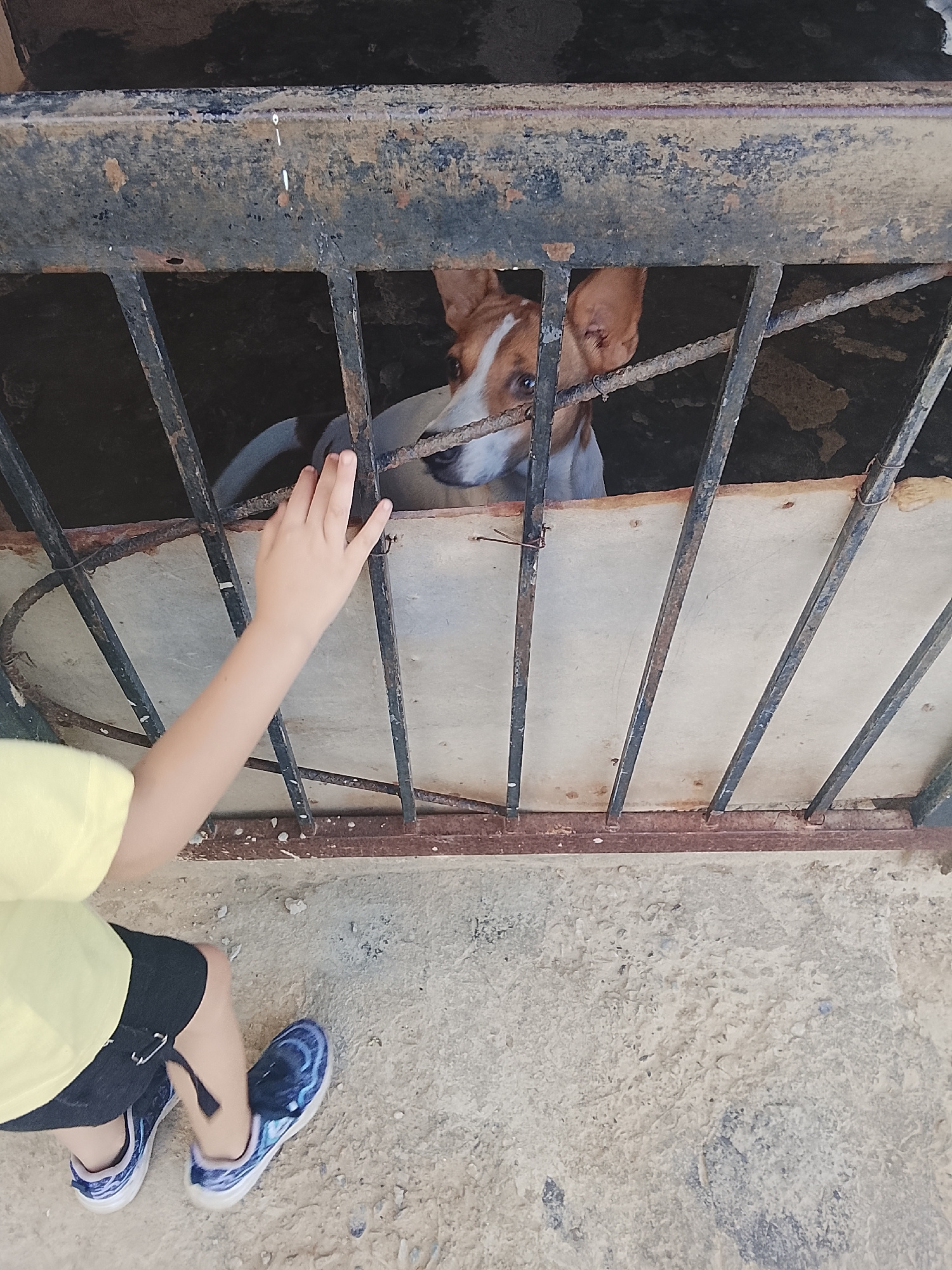A child extends their hand towards a dog peering through a metal grate. The child wears a yellow shirt, black shorts, and blue sneakers. The dog has white and brown fur and is positioned behind the gr…read more