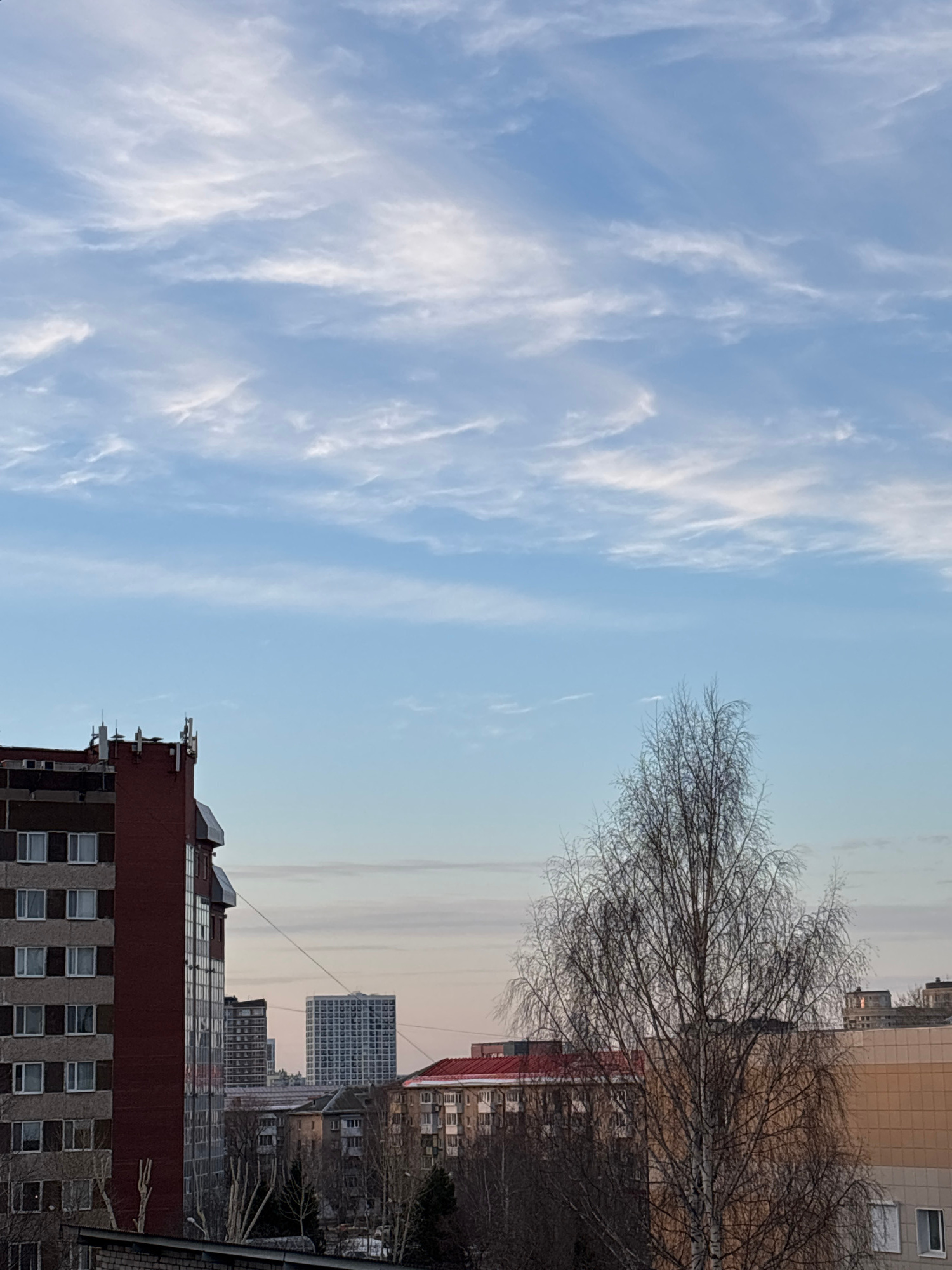 The image shows a cityscape in Perm, Russia, under a partly cloudy sky. The foreground features a multi-story brick building with windows. Behind it, there are several more buildings of various sizes…read more