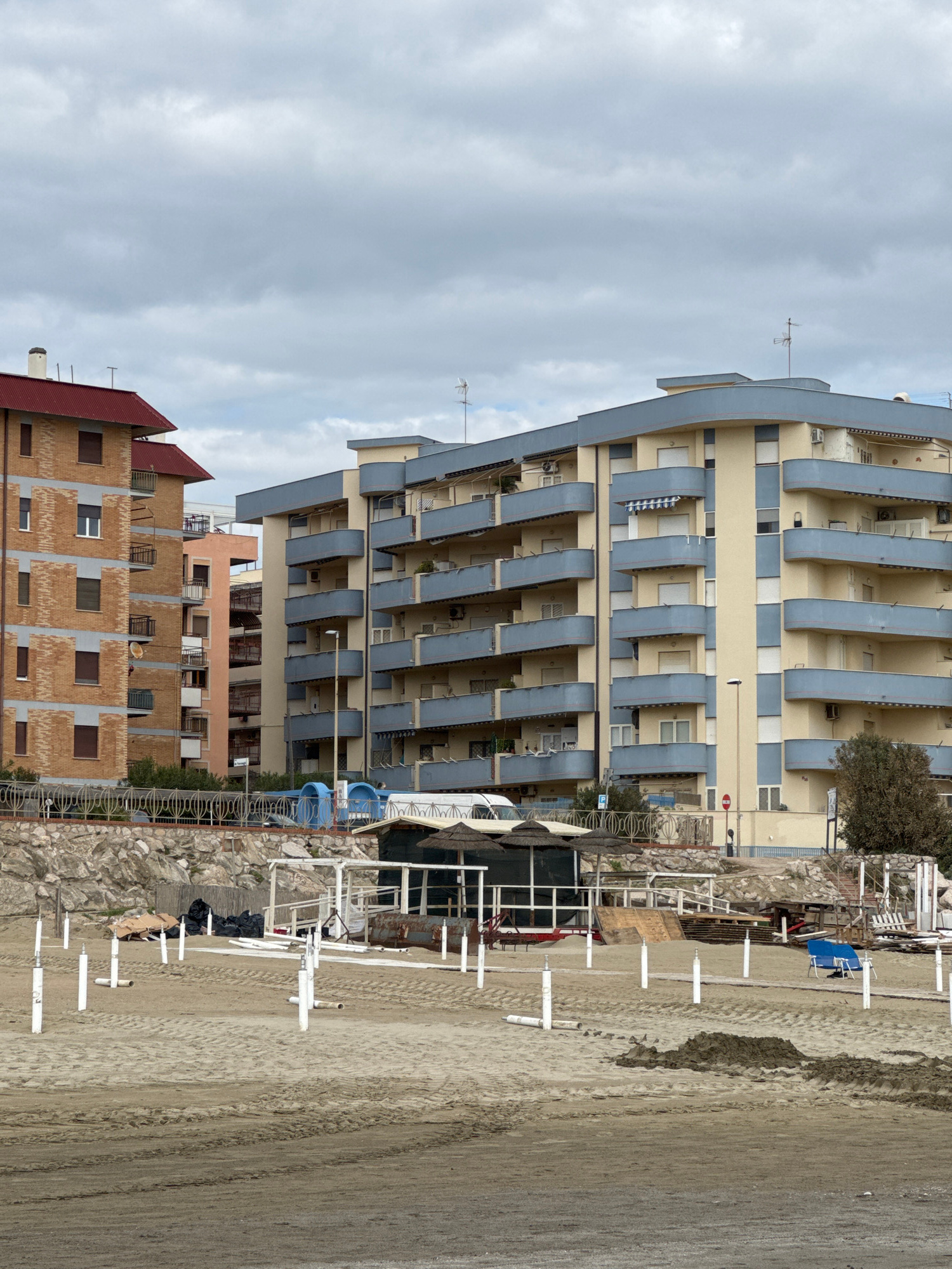 The image captures a coastal scene in Nettuno, Italy, featuring a row of multi-story buildings overlooking a sandy beach under an overcast sky. The most prominent subject is a tall building with a li…read more