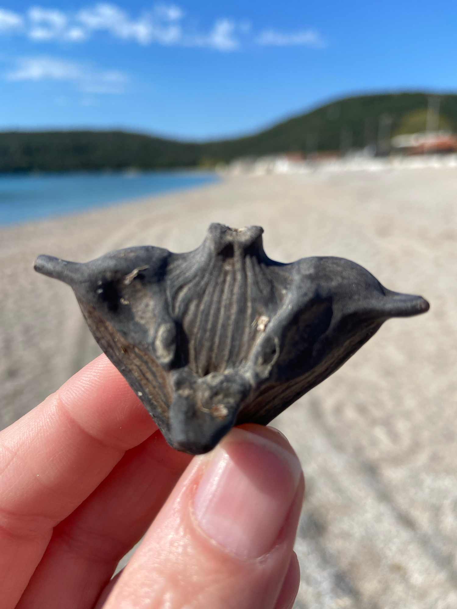 A person holds a dark, horn-like object in their hand. The object has a ridged texture and several horn-like protrusions. The background reveals a beach environment. To the left, there is a blurry, ve…read more