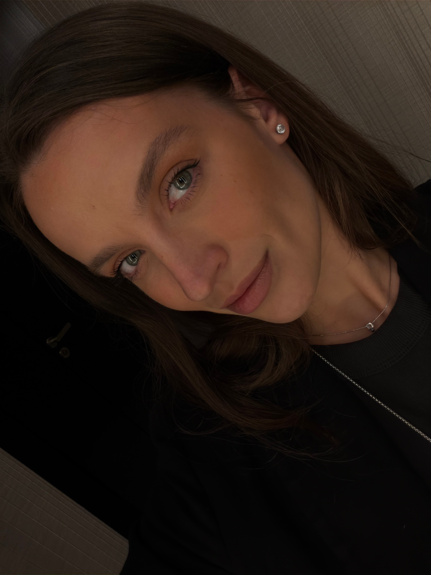 A close-up, slightly tilted, low-lit photograph depicts a light-skinned woman with brown hair. She has light-colored eyes and is wearing a small stud earring and a delicate silver necklace. The backgr…read more