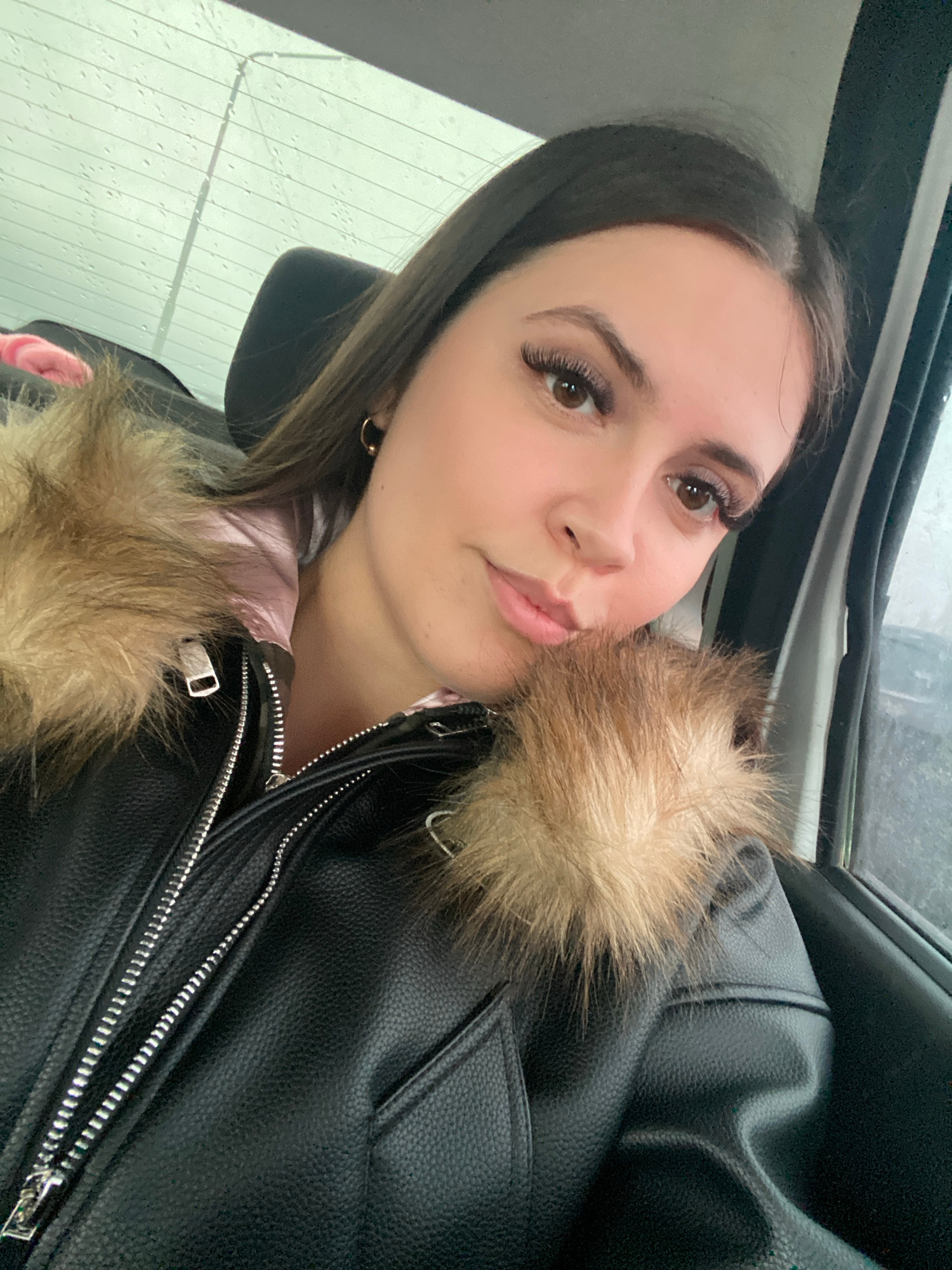 A person with long brown hair is taking a selfie, wearing a black leather jacket with fur trim, inside a vehicle. The backdrop shows rain on a window, which suggests the environment may be outdoors. Nβ¦read more