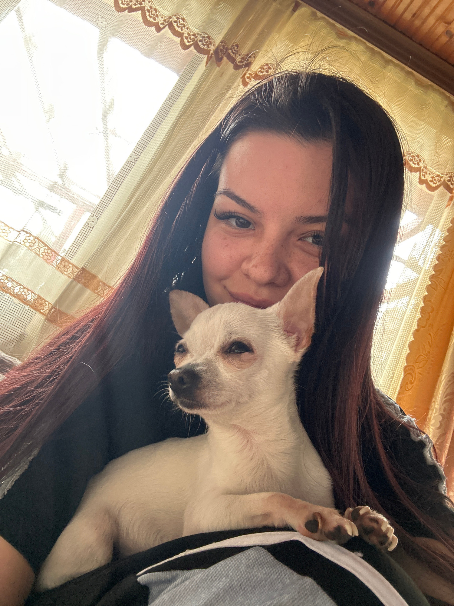 A fair-skinned woman with long, dark reddish-brown hair is holding a small, white Chihuahua-like dog. The woman has visible freckles and appears to be smiling slightly. The dog is held close to her face, and its head is visible, as is one paw with dark claws. The background features a window covered with a light-colored, patterned curtain. The location cannot be determined to be in Skala, Bulgaria from the image alone. | Open Wire