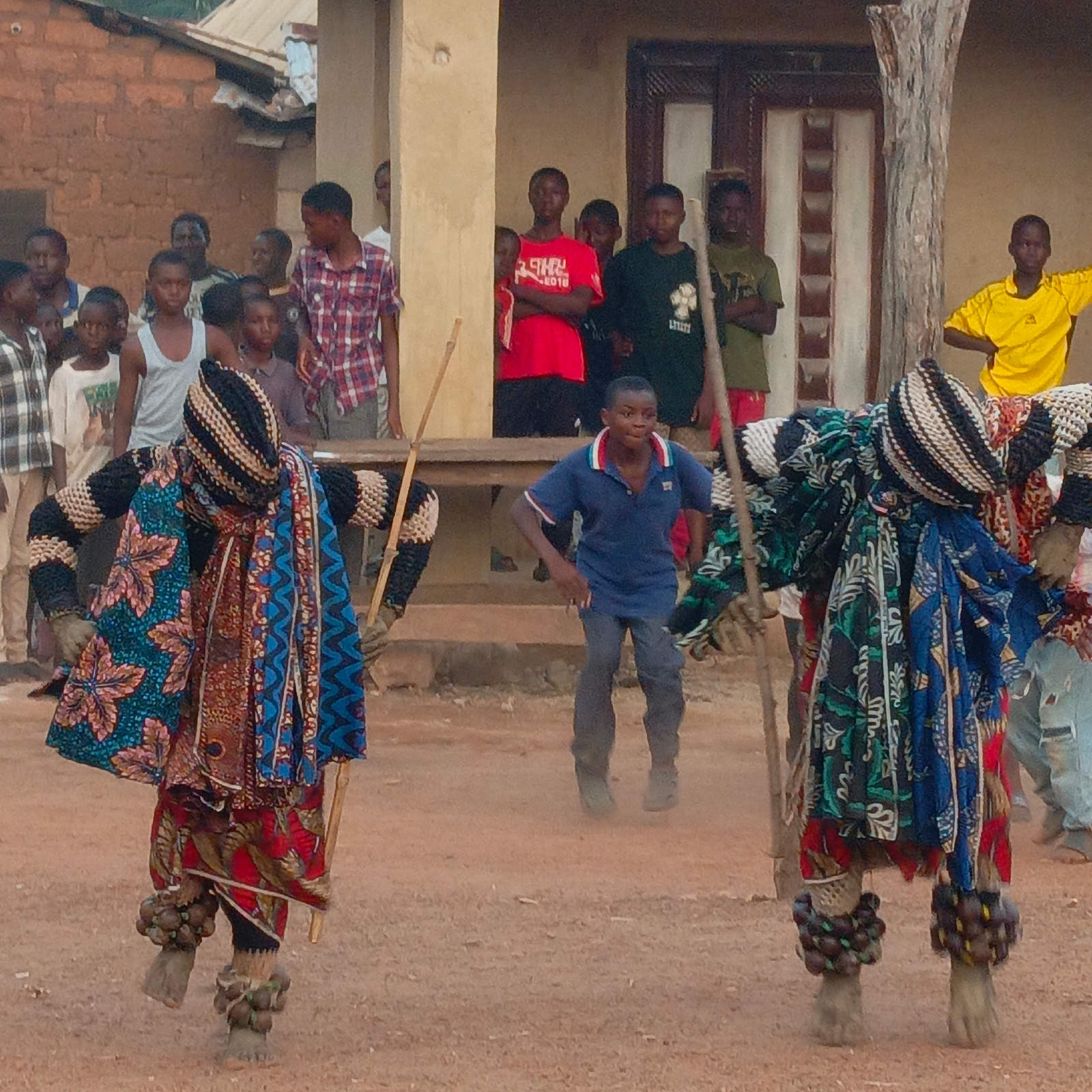 The image depicts an outdoor scene in Akwanga, Nigeria. Two figures dressed in elaborate, colorful costumes dominate the foreground. They appear to be performing or participating in a traditional cere…read more