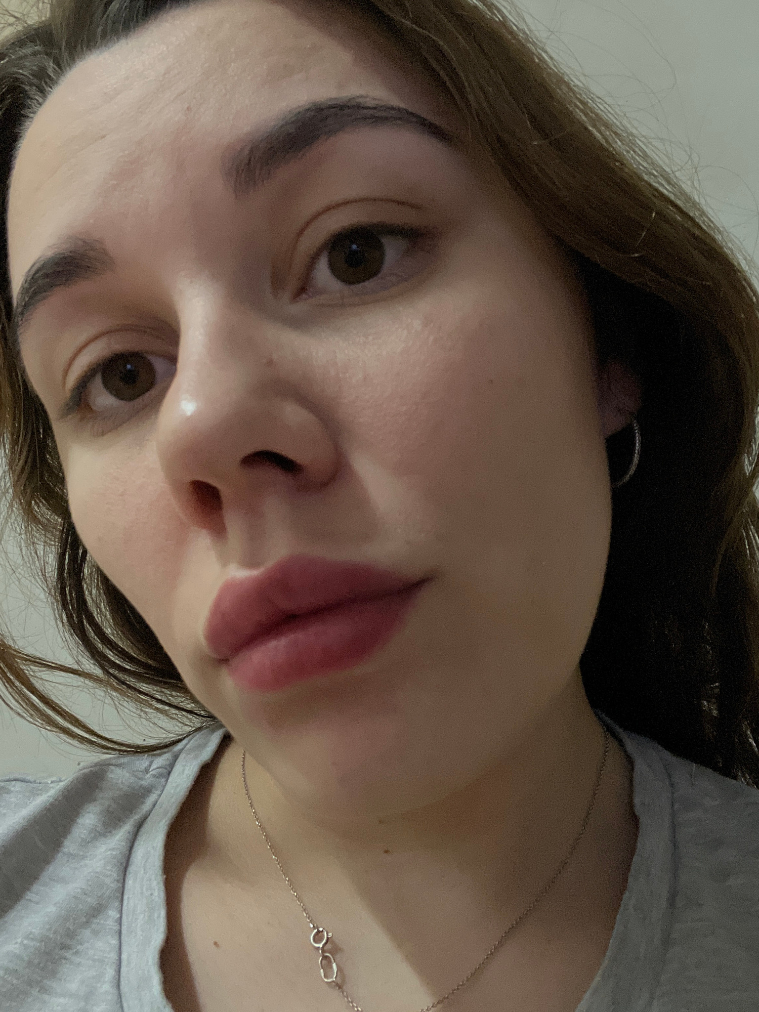 A close-up, angled selfie of a woman with light skin, brown eyes, and dark eyebrows. She has dark brown hair and is wearing a gray t-shirt and a silver necklace. An earring is visible in her left ear.…read more