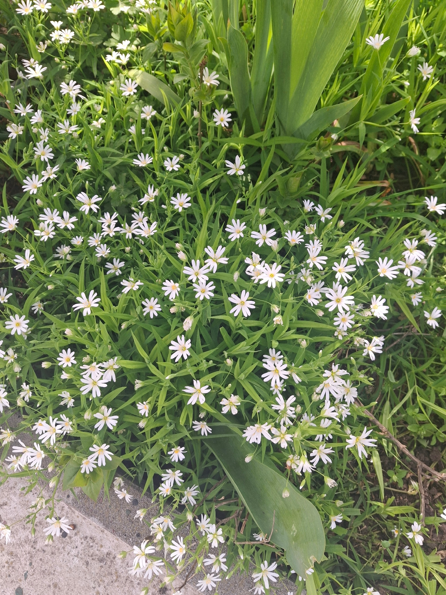 The image depicts a patch of white, star-shaped flowers growing amidst green grass and foliage, adjacent to a concrete surface. Some larger leaves are present among the smaller grass blades. The locat…read more
