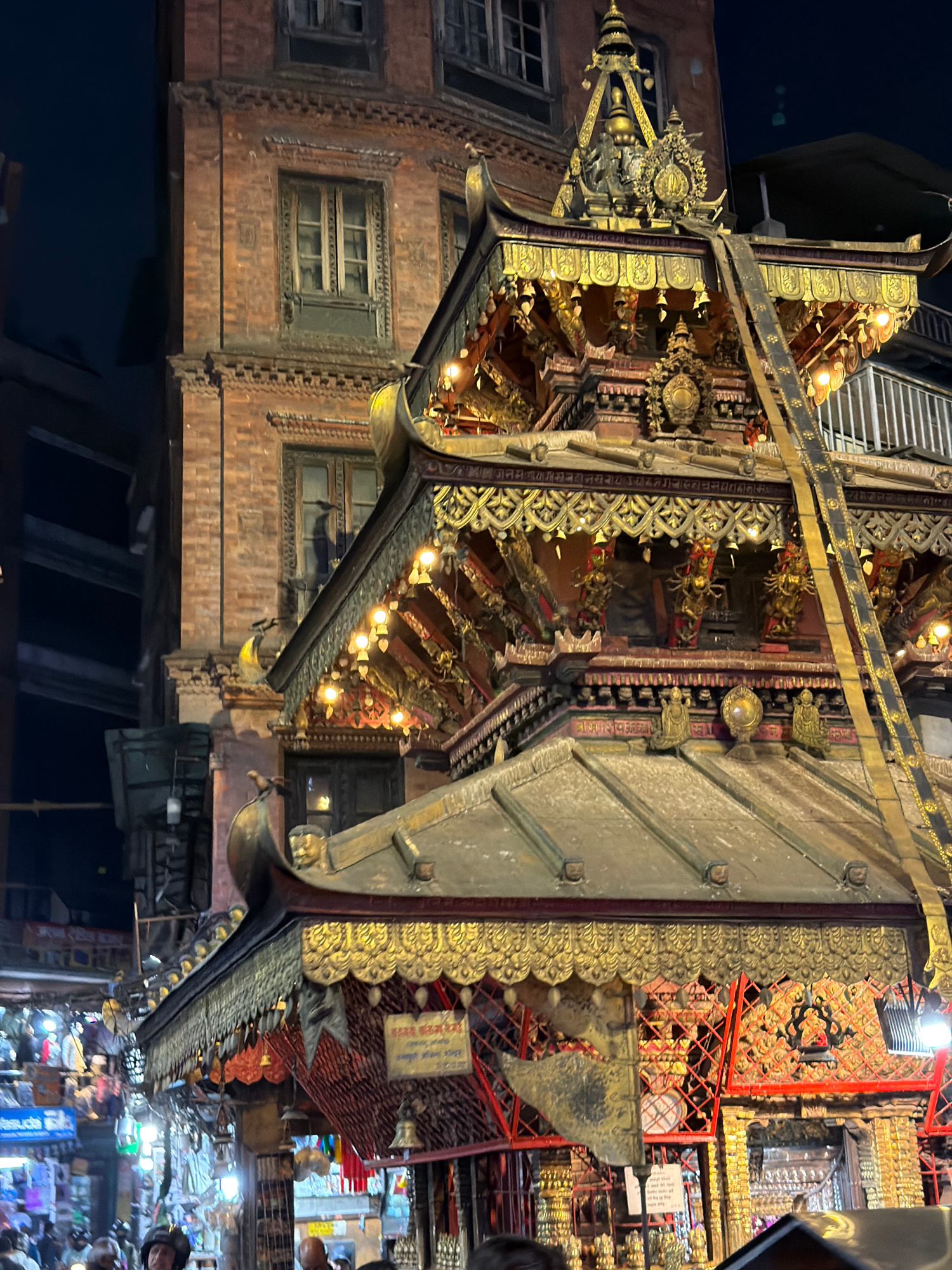 The image captures a highly ornate, multi-tiered structure in Kathmandu Metropolitan City, Nepal. The structure features intricate carvings, gold accents, and a red framework. The building it is attac…read more