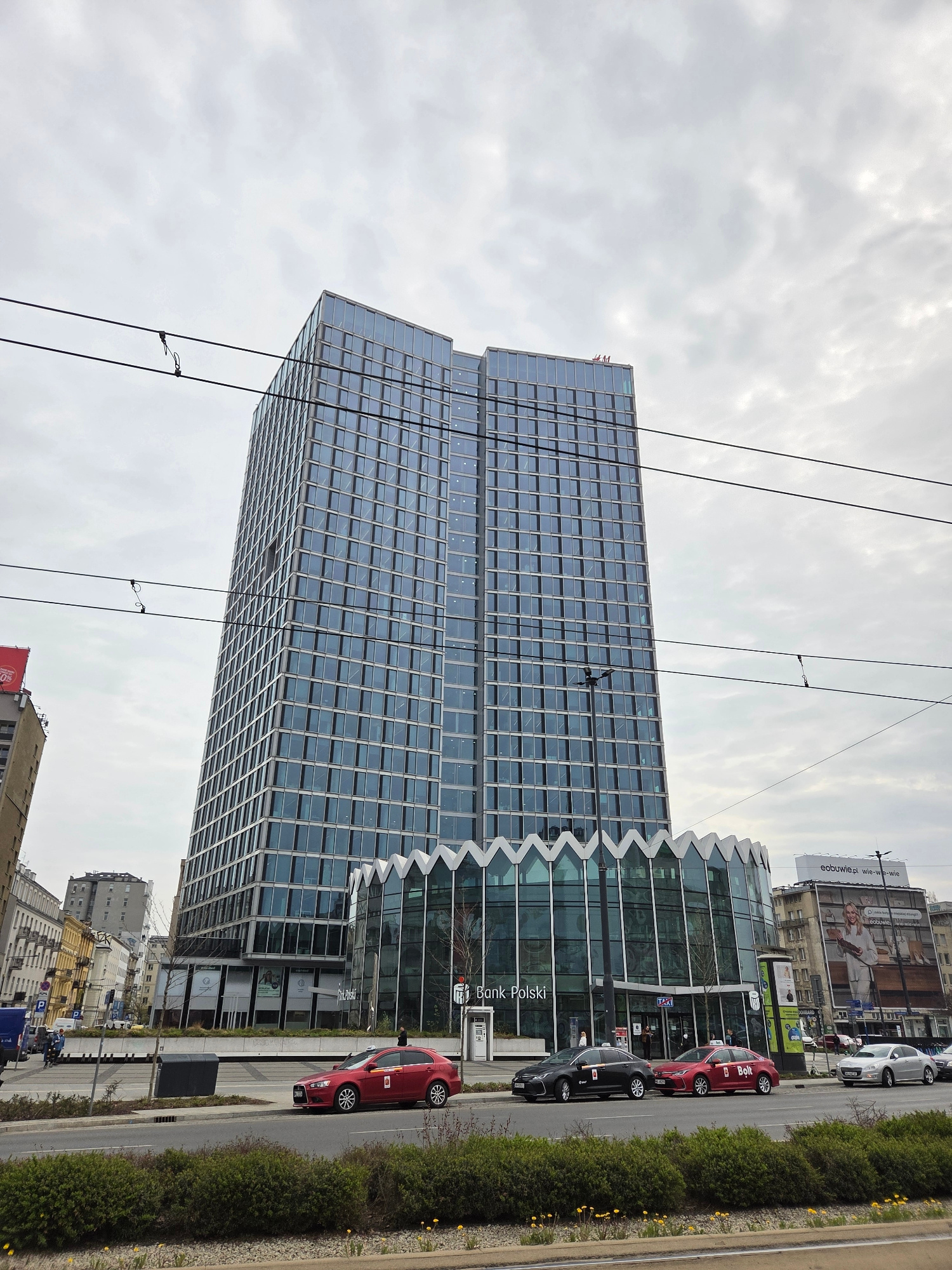 Here is a description of the image: The image captures a view of a modern glass-fronted building in Warsaw, Poland, identified by the "Bank Polski" signage on its facade. The building's design featur…read more