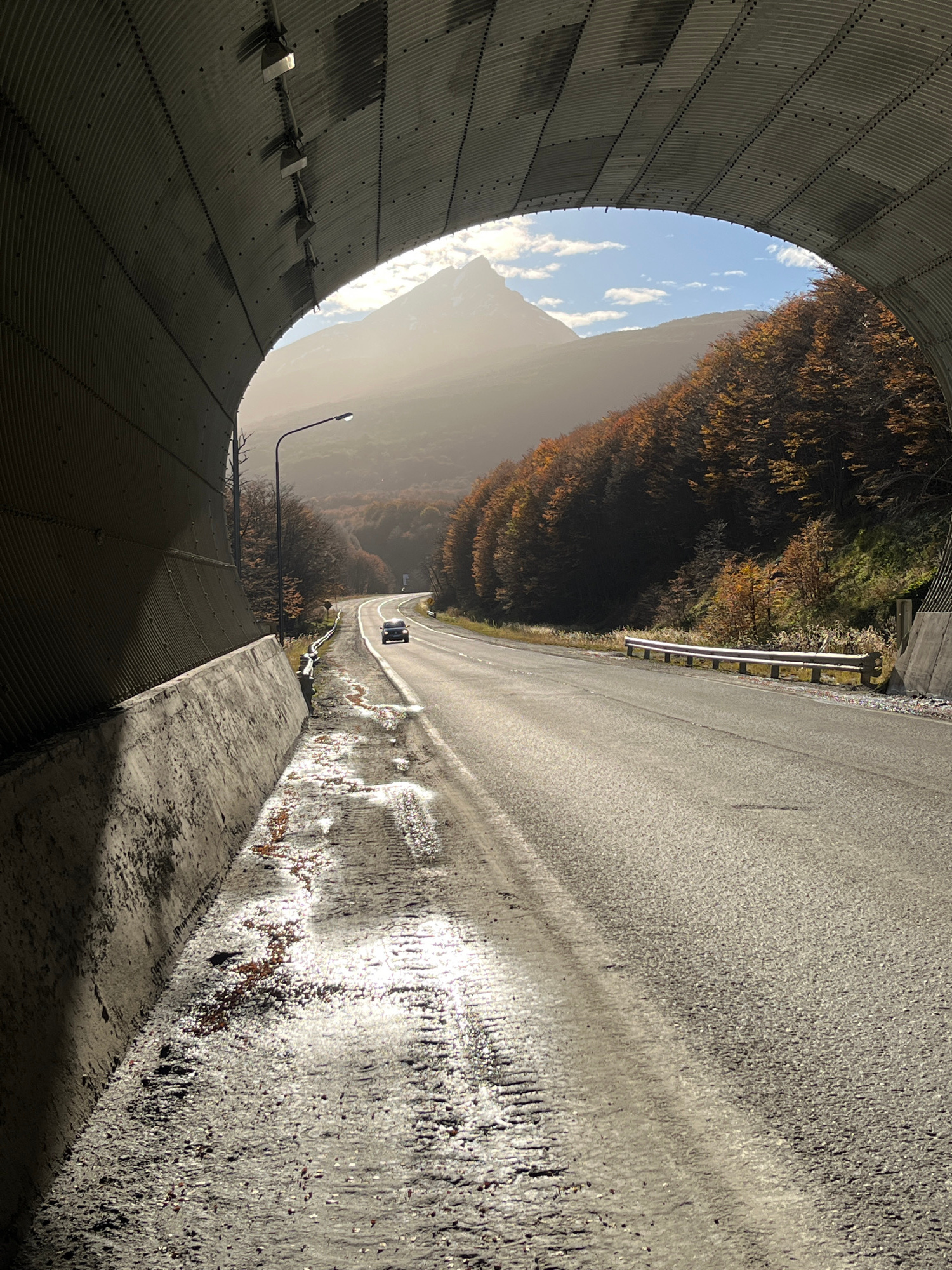 The image presents a dynamic view looking out from within a large, curved, corrugated metal structure, likely an avalanche shed or tunnel entrance. This structure forms the left and bottom-left portio…read more