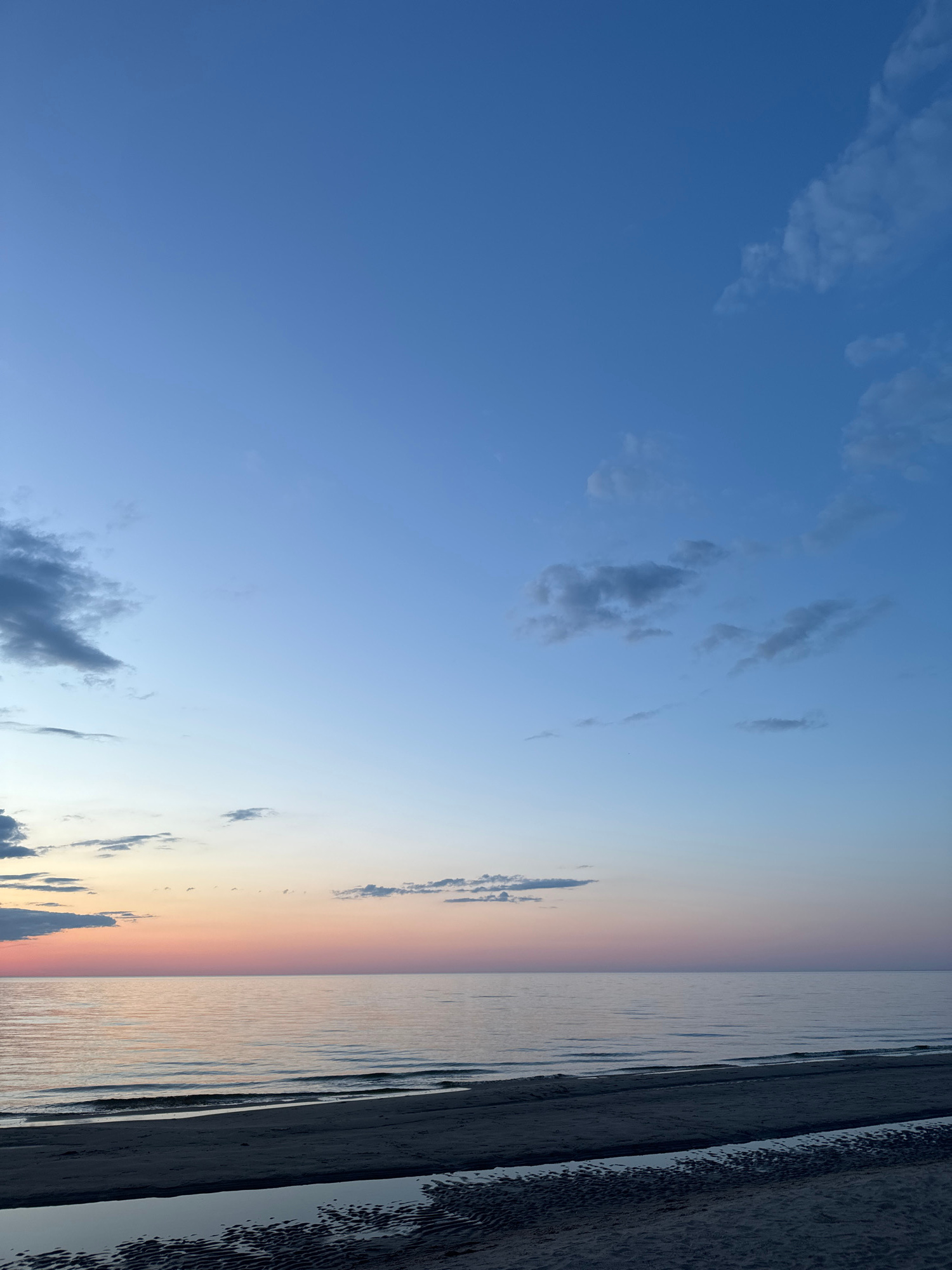The image shows a sunset scene at the beach in Carnikava, Latvia. The sky transitions from blue to orange-pink near the horizon, with scattered clouds. The sea reflects the sunset colors. The beach sa…read more