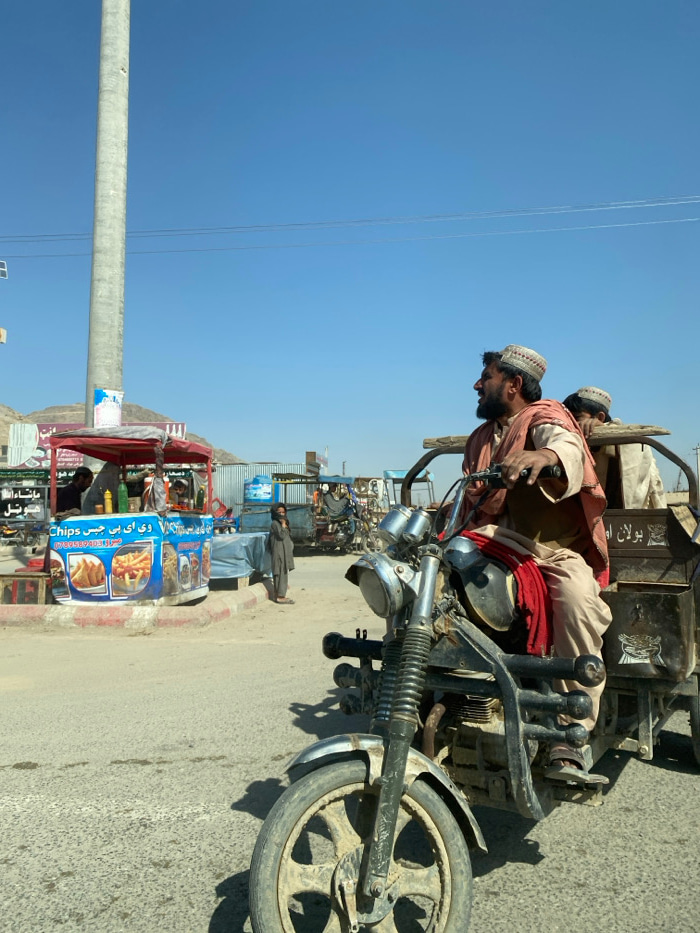 A sunny, outdoor scene in Qazi Kariz, Afghanistan, depicts a street with market activity. In the immediate foreground and center-right, a dark-colored, three-wheeled motorcycle rickshaw is positioned…read more