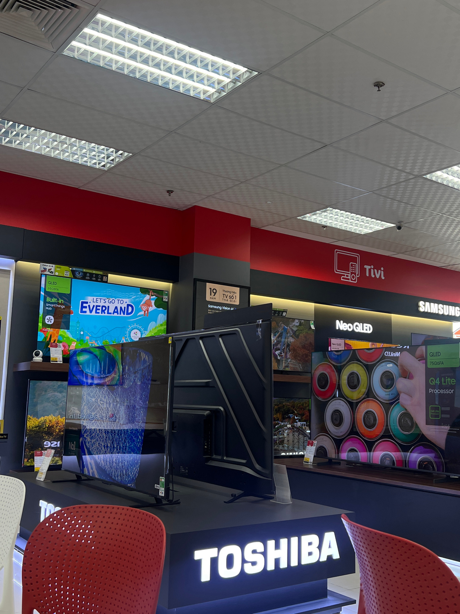 The image shows a selection of televisions on display in a store located in Nha Trang, Vietnam. Brands prominently featured include Toshiba, Samsung, and Tivi. A red wall with the "Tivi" logo is visib…read more