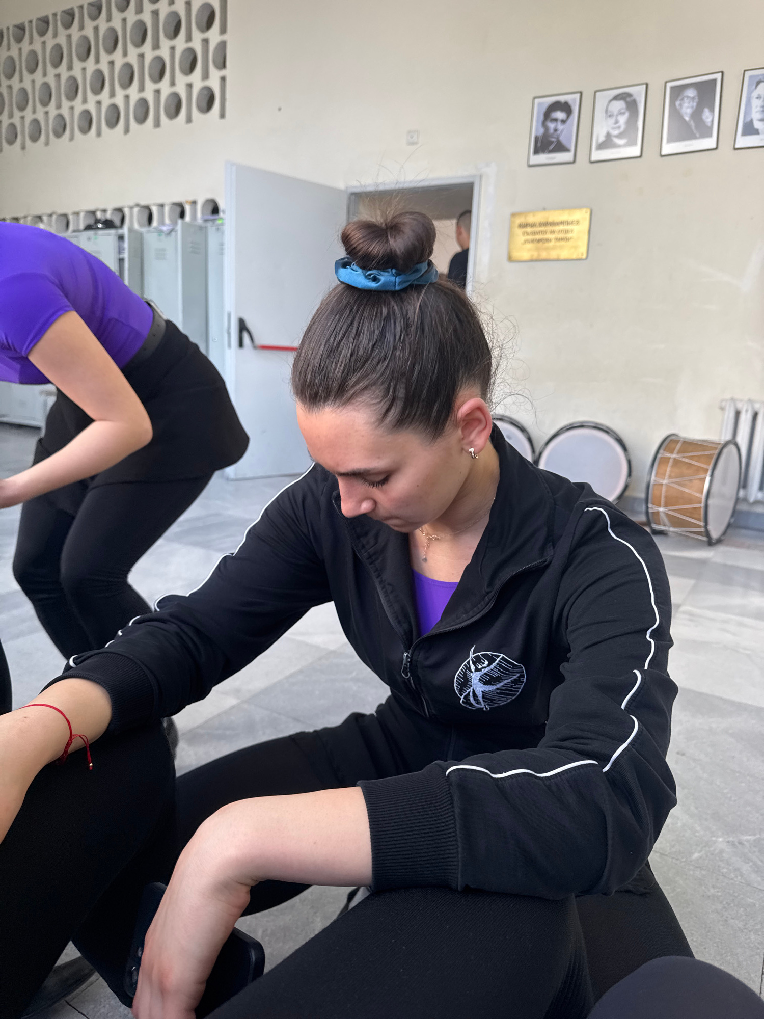 This media file captures an indoor scene, likely a practice or studio space in Sofia, Bulgaria. The central subject is a person with dark hair tied in a bun with a blue scrunchie, positioned in the fo…read more