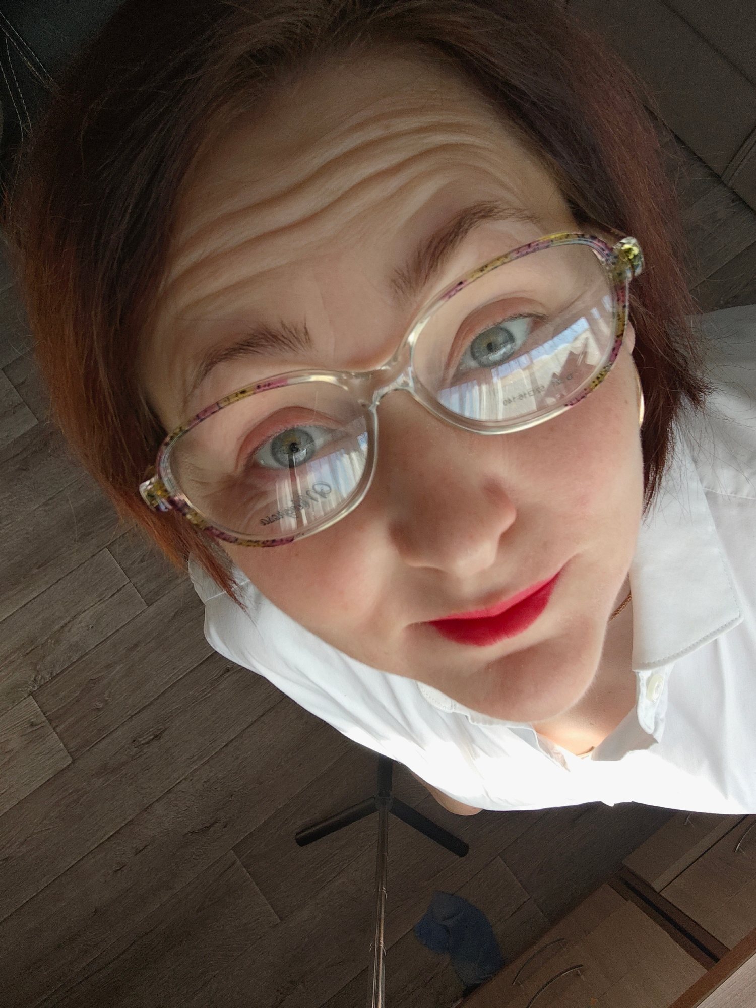 A woman with auburn hair and fair skin is centered in the frame, looking directly at the camera from a low angle. She is wearing glasses with decorative frames. Her lips are painted bright red. She is…read more