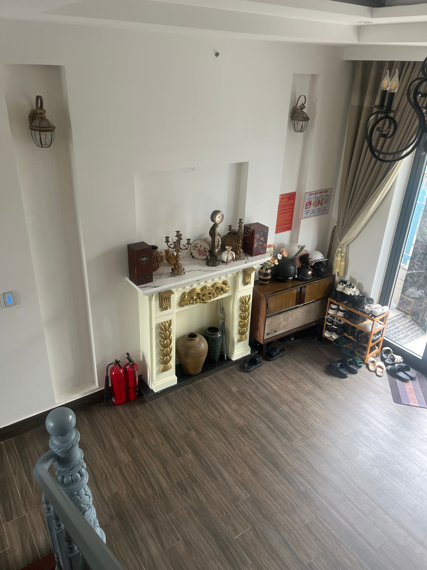 The image shows the interior of a home, likely in Đà Nẵng, Vietnam. The space features tiled flooring, a white wall with recessed shelves containing decorative items and a mounted lantern-style light…read more