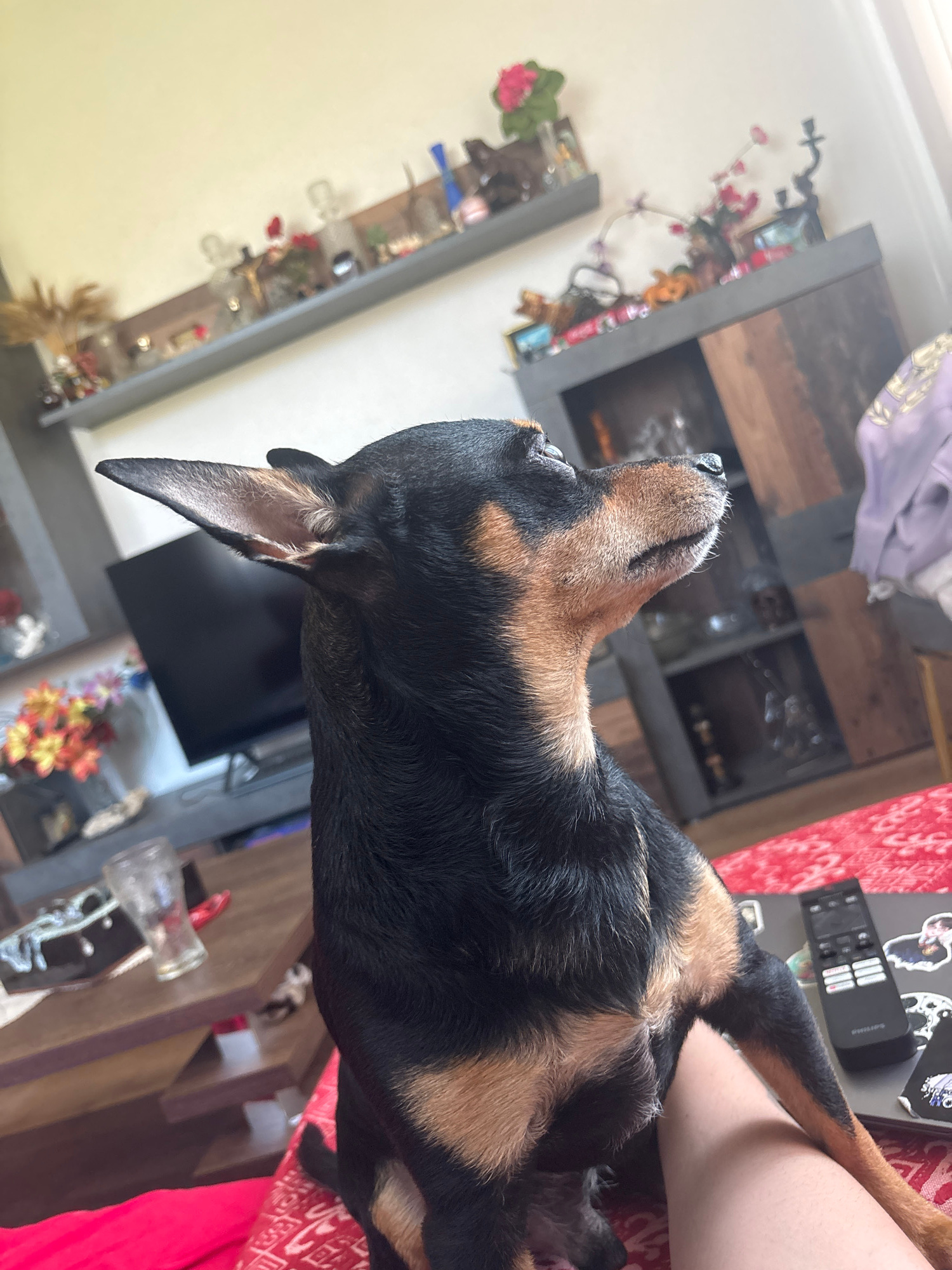 A close-up, high-angle shot depicts a black and tan dog, possibly a miniature pinscher, lying on a red patterned fabric near a light-skinned person. The dog's head is tilted back. A remote control and…read more