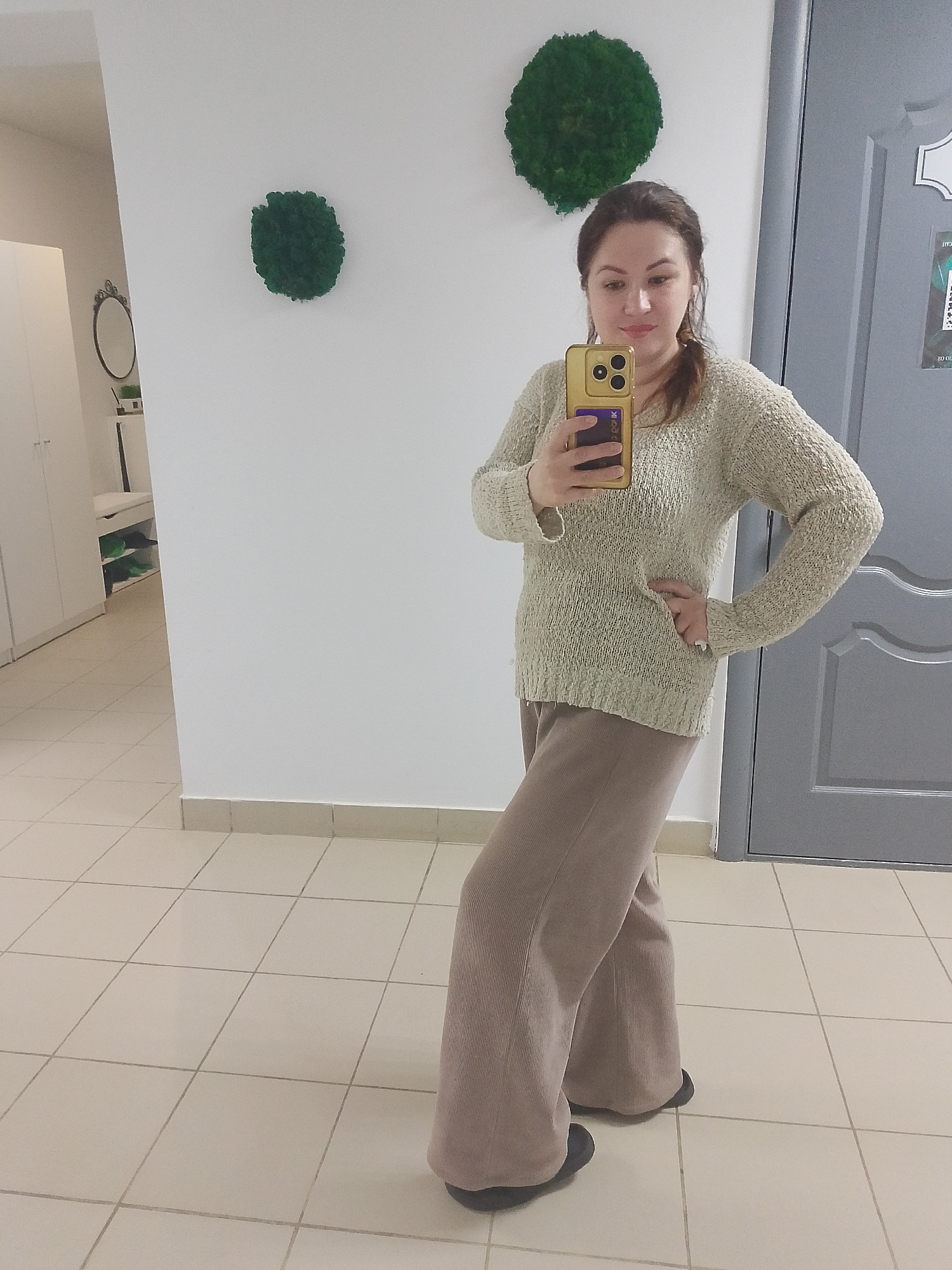 In an indoor full-body mirror selfie taken in Chaikovsky, Russia, a woman stands facing forward, slightly angled to her right, holding a gold-colored smartphone with a purple/blue card visible in its…read more