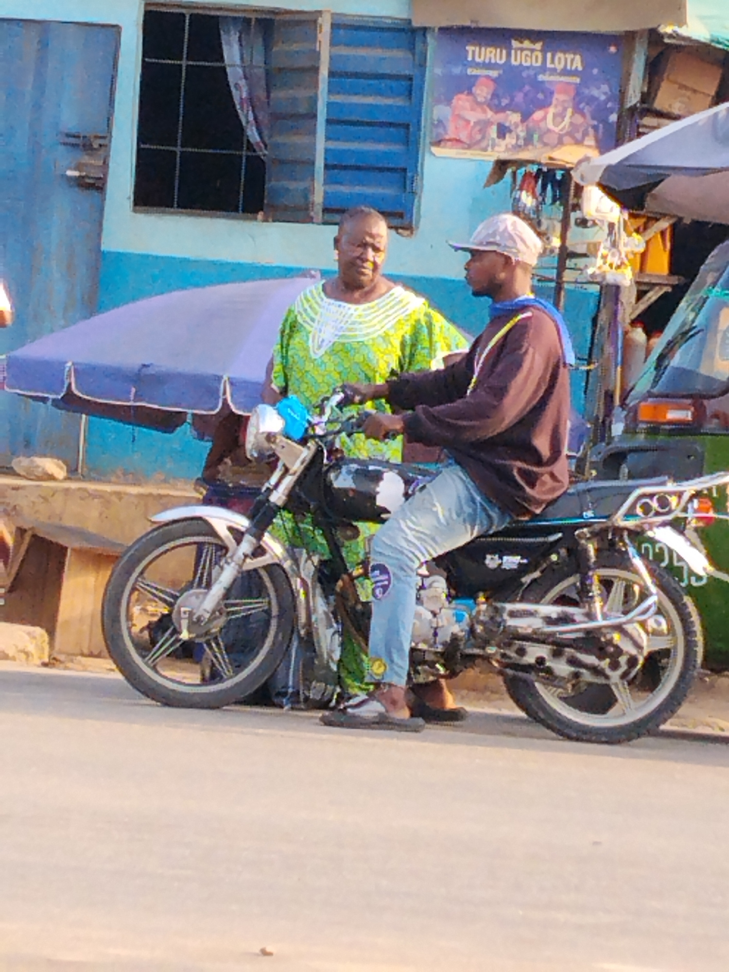 A man wearing a brown sweatshirt, blue jeans, and a baseball cap is seated on a black motorcycle. He is wearing a blue scarf around his neck. An older woman in a green and yellow patterned dress is st…read more