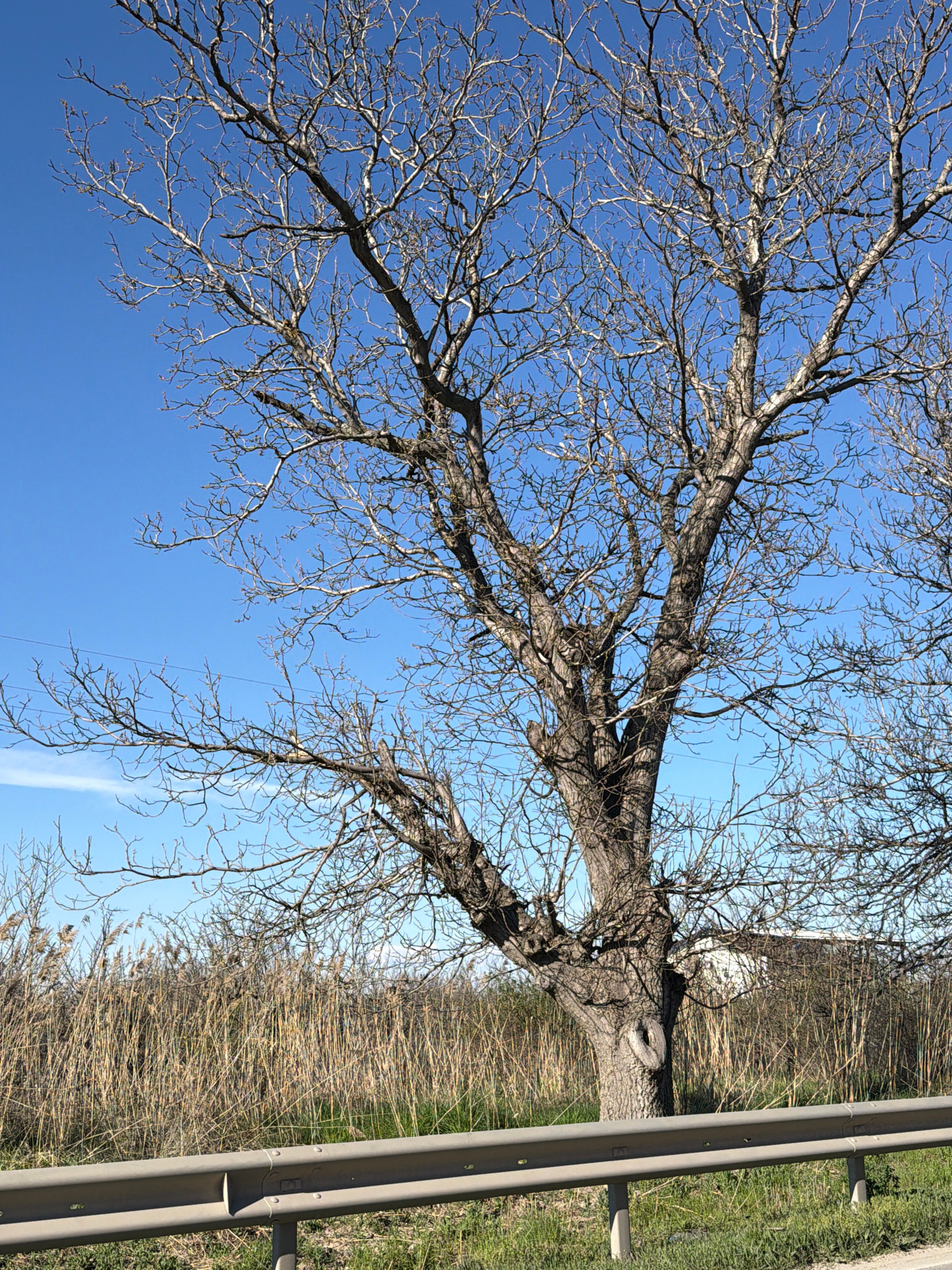 A large tree with bare branches dominates the left side of the frame against a clear blue sky. The trunk is substantial and positioned near the center of the image, with branches reaching upwards and…read more