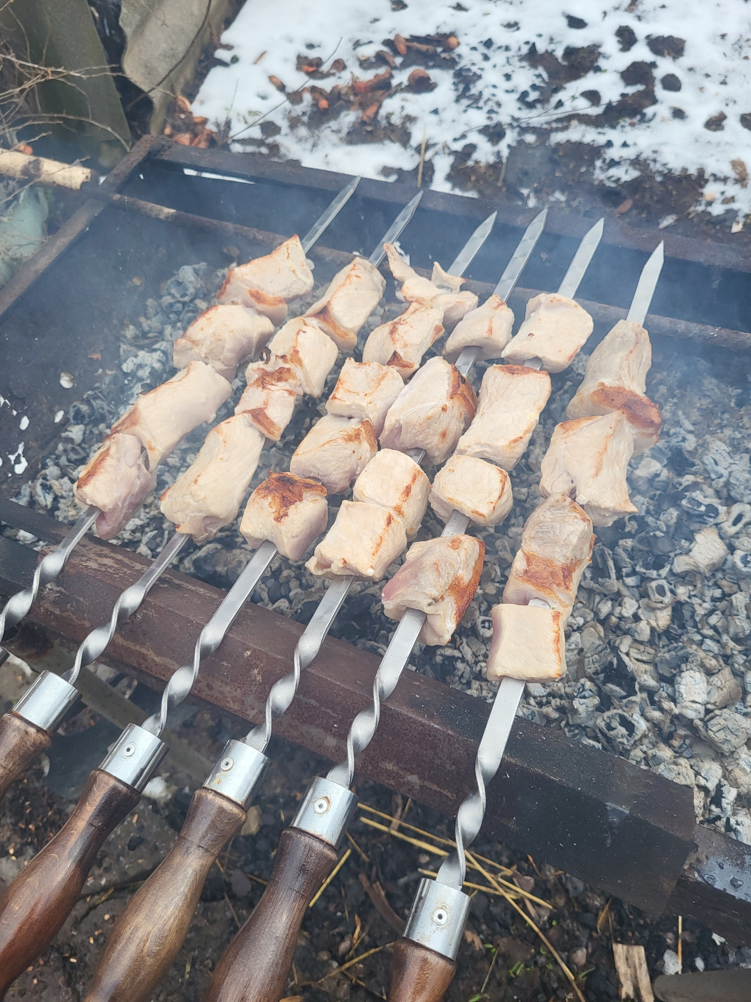 The image shows four skewers of meat, possibly pork or chicken, cooking over a charcoal grill. The skewers are made of metal with twisted sections and wooden handles. The meat is cut into roughly cube…read more