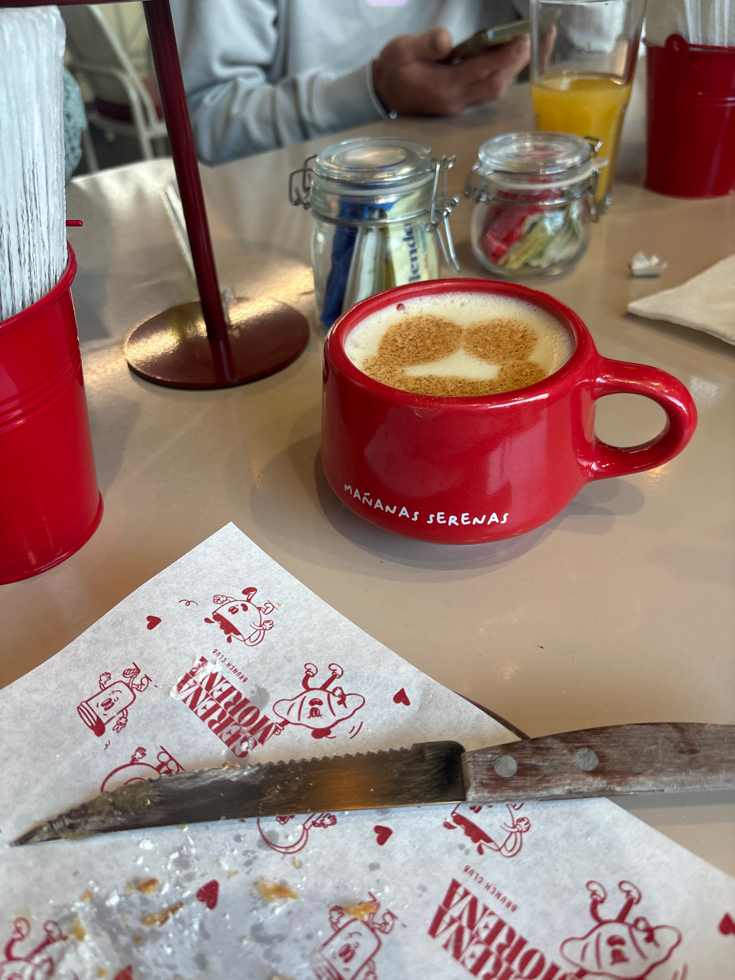 The image depicts a tabletop scene, likely inside a café in Puebla, Mexico, evidenced by the "Mañanas Serenas" branded red mug filled with a coffee drink, and the "Serena Morena Brunch Club" branded p…read more
