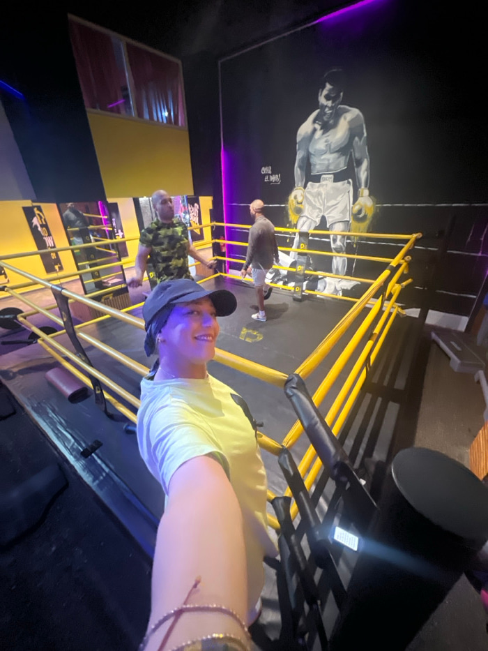 Inside a boxing gym, a person in a light yellow shirt and dark hat takes a selfie. Behind them stands a boxing ring with yellow poles and black ropes. An older man wearing a camouflage shirt and anoth…read more