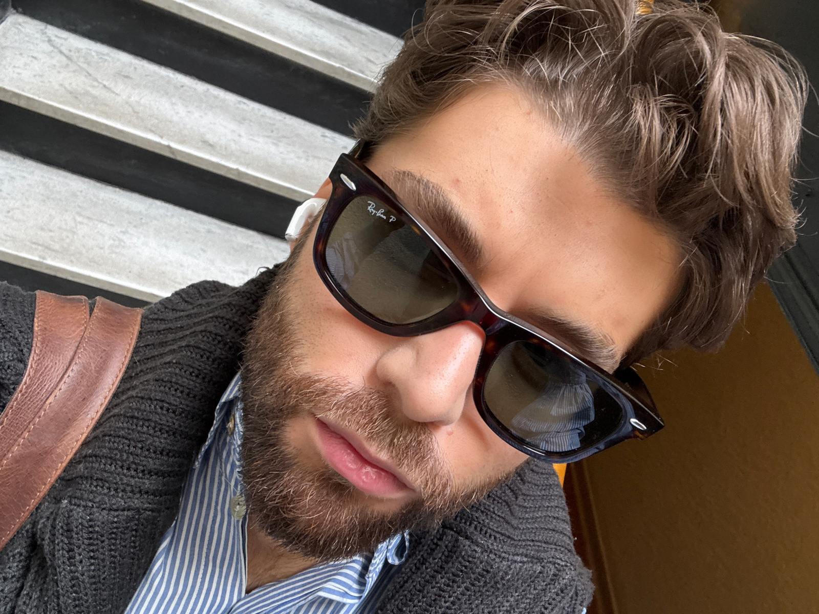 The image is an upward-angled, close-up portrait of a man, possibly taken in Montreal, Canada. His head is tilted back, and he is looking directly towards the camera. He has a full, neatly trimmed broβ¦read more