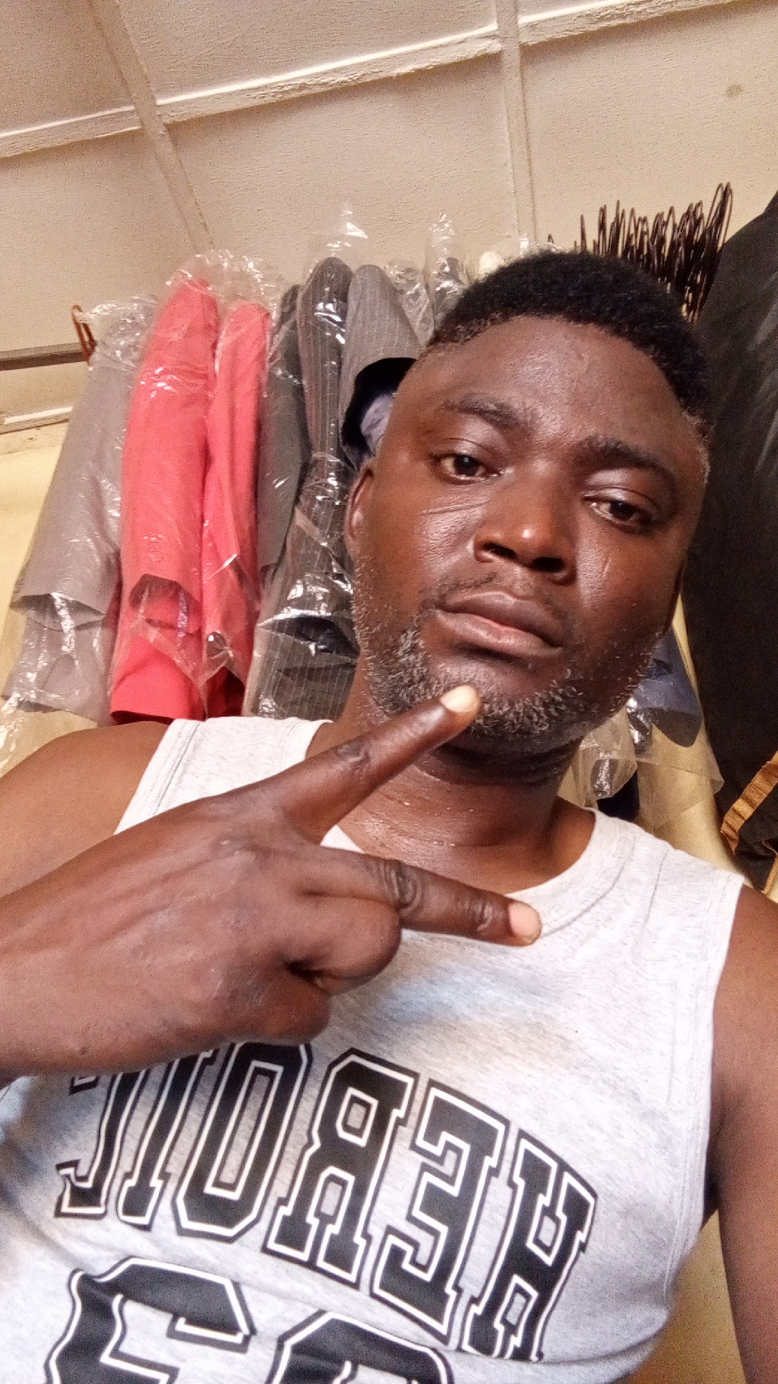 A man is posing for a selfie in what appears to be an indoor environment with clothing racks in the background. The man is wearing a grey tank top with a black and white graphic design on the front. H…read more