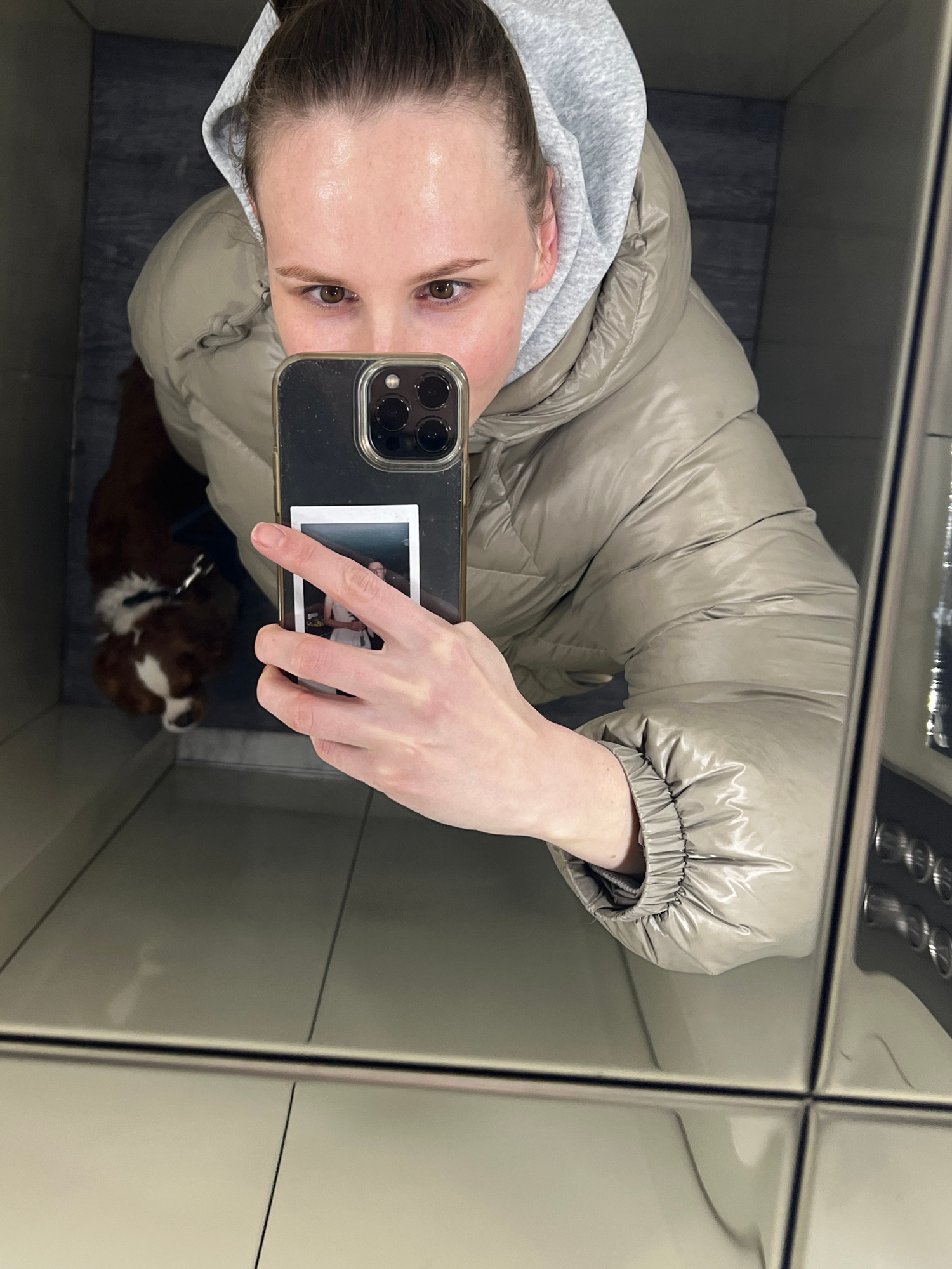 A woman is taking a selfie in what appears to be a mirrored elevator. She's wearing a light grey puffer jacket with a hood and holding a phone with a photograph attached to the back. A dog is visible…read more