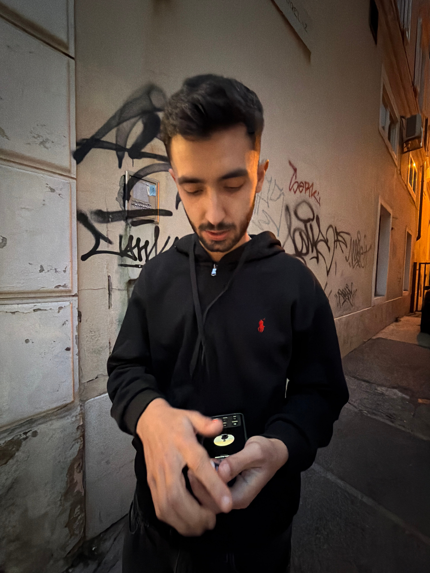 A man is standing on a street in the city of Grad Rijeka, Croatia. He is wearing a black hoodie with a red logo and holding a smartphone in his hands. The background features a wall covered in graffit…read more