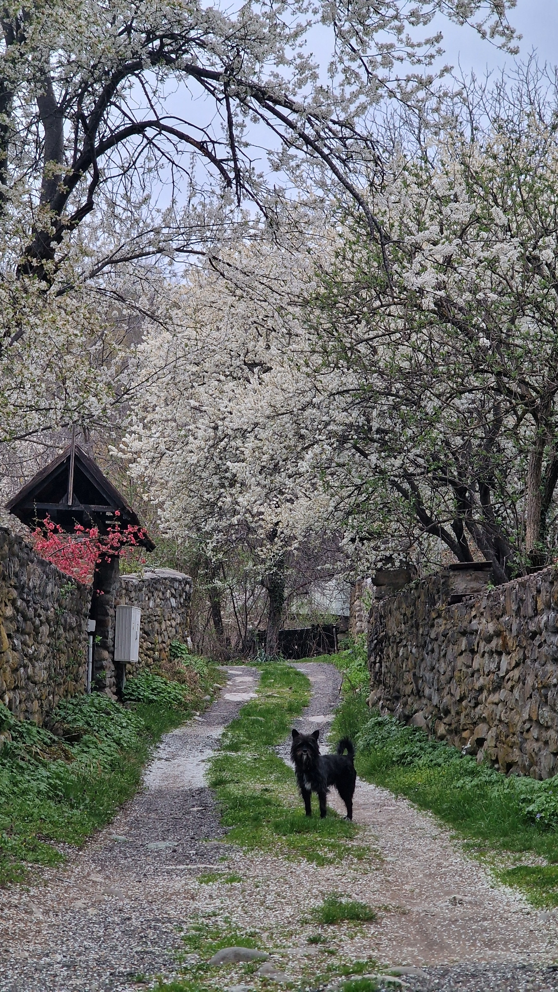 The image is a landscape photograph taken in Apriltsi, Bulgaria, showcasing a narrow, gravel path flanked by stone walls and abundant vegetation. The path, slightly wet, is bordered by green grass and…read more