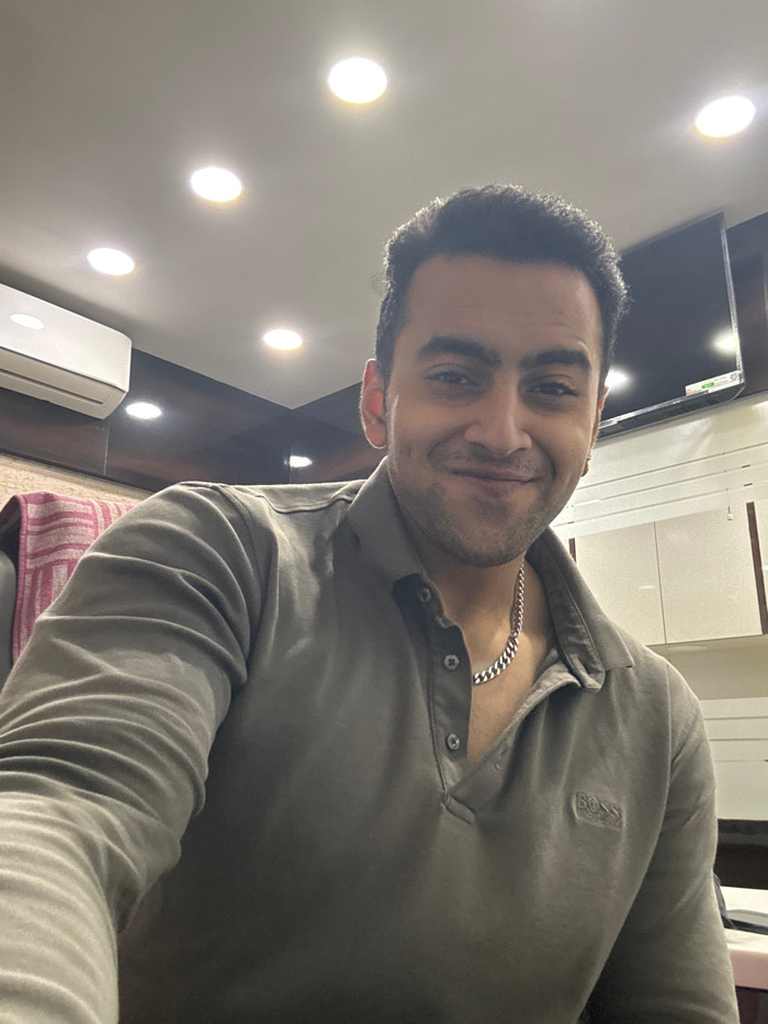 The image features a man taking a selfie indoors. He has short dark hair, dark eyes, and a subtle smile on his face, looking directly at the camera. He is wearing a long-sleeved polo shirt in a grey o…read more