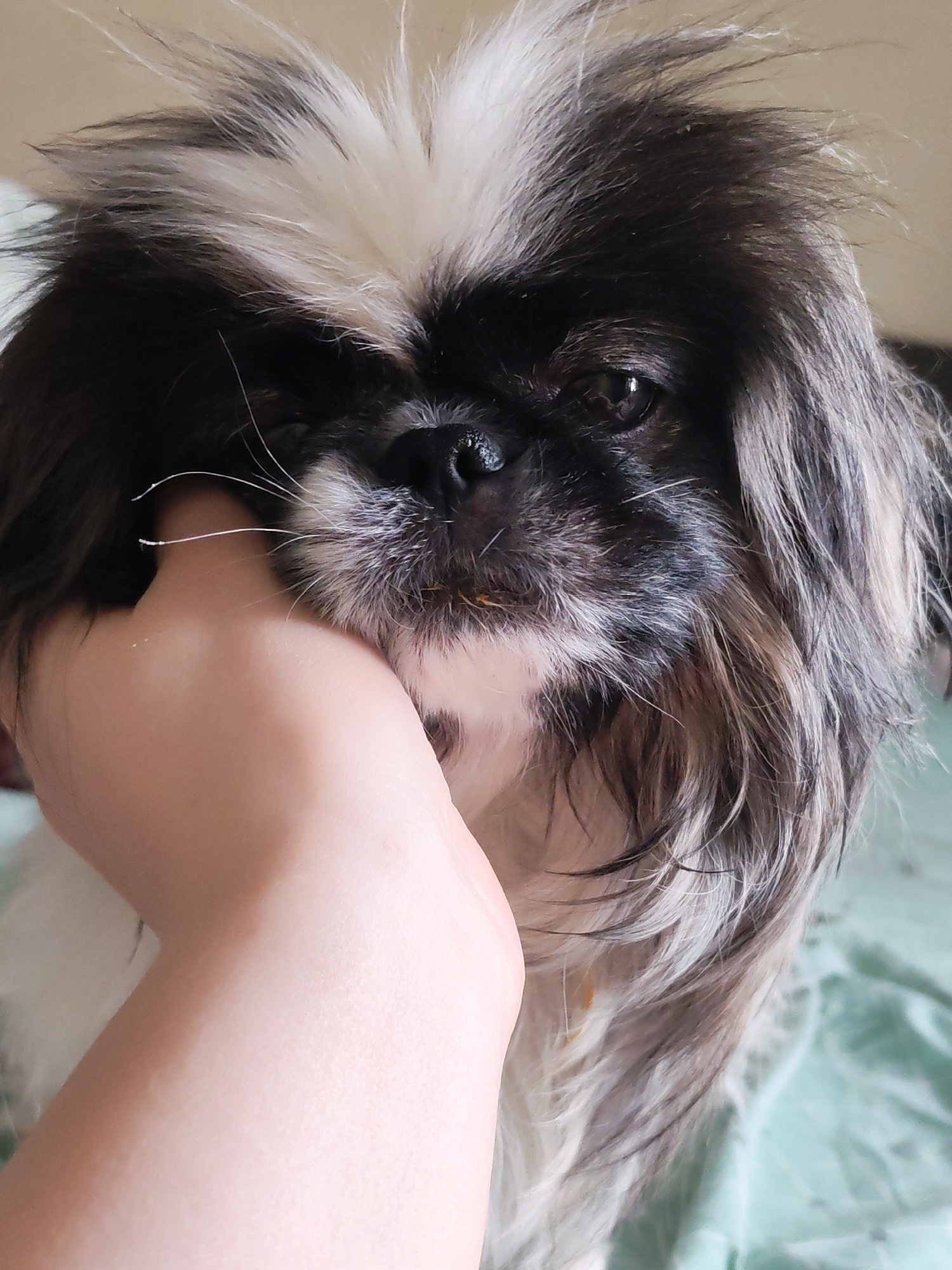 A close-up shot features a black and white Pekingese dog being held by a human hand. The dog has long, shaggy fur, a black nose, and dark eyes. A hand, assumed to be of an adult human, is cradling theβ¦read more