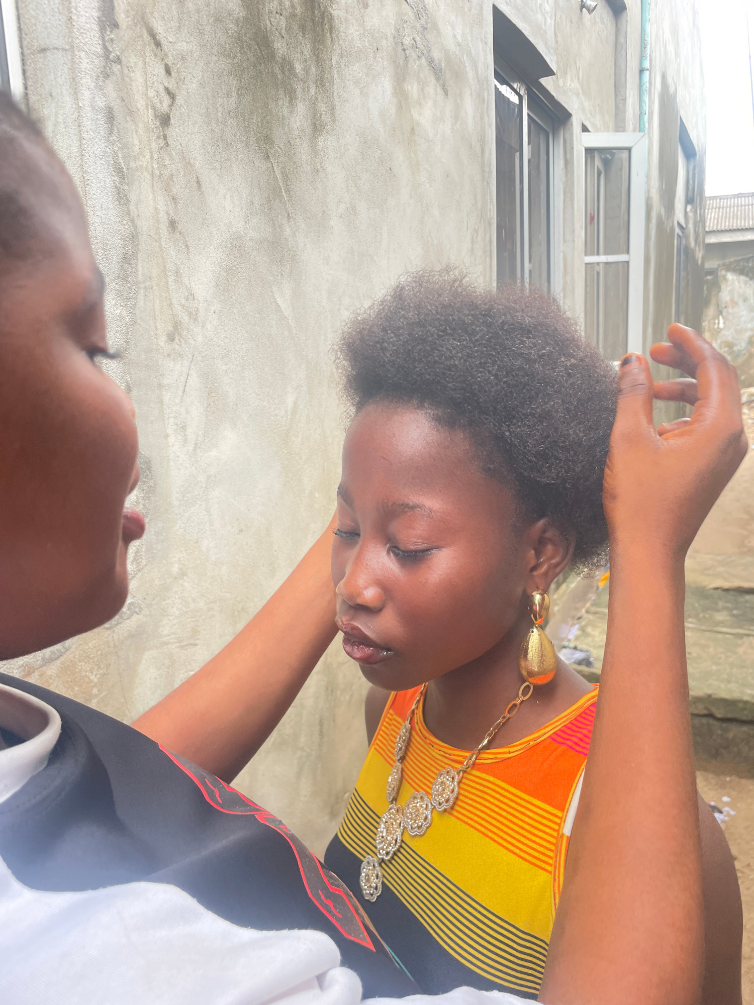 The image, rotated onto its side, captures a close-up interaction between two individuals in what appears to be an outdoor or semi-outdoor setting in Badagry, Nigeria, during the daytime. In the mid-…read more