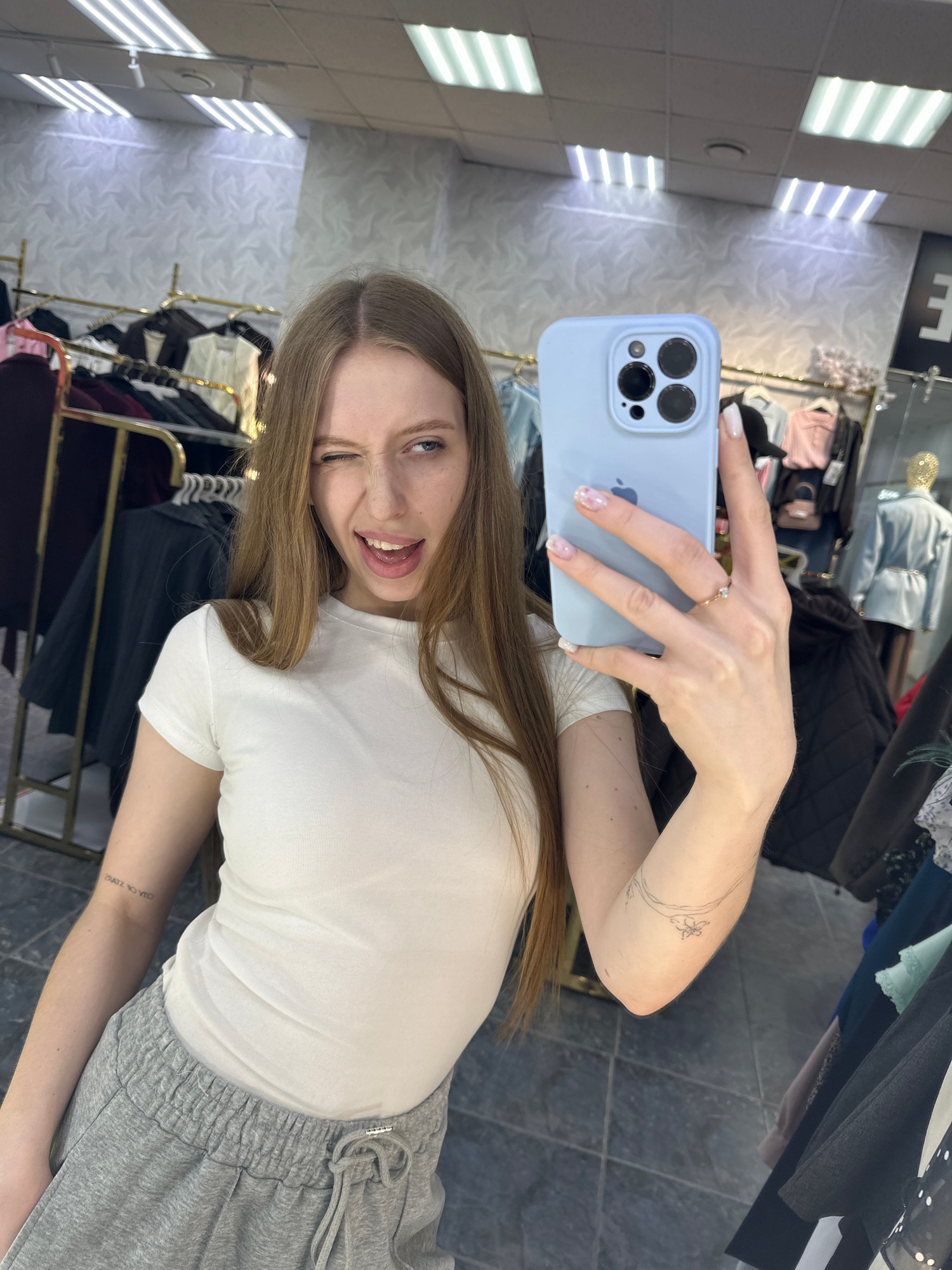 A young woman is taking a selfie in what appears to be a clothing store. She is holding a blue smartphone in her right hand, showcasing a ring on her ring finger and nail art. She is winking and stick…read more