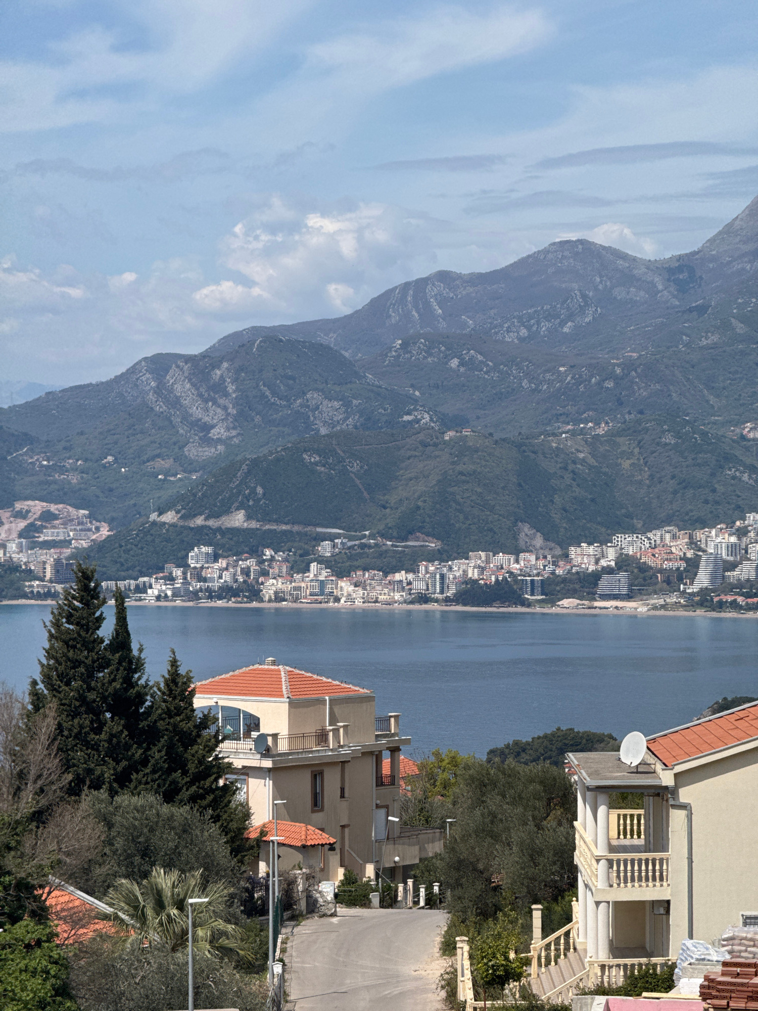 The scene depicts a coastal area in Blizikuće, Montenegro. A body of water, likely the Adriatic Sea, separates a dense mountain range from a coastal town. The town, populated with buildings of varying…read more