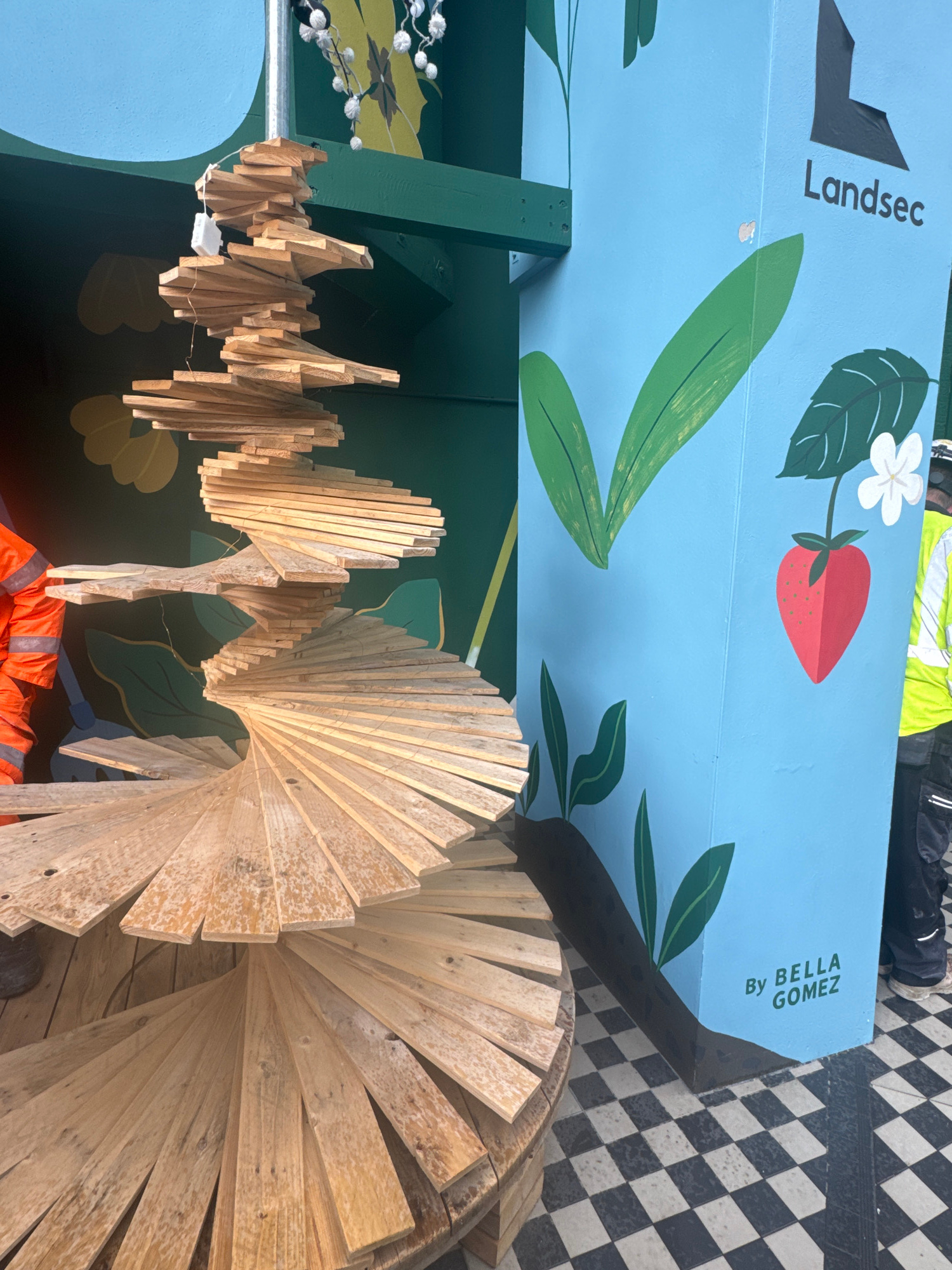 The image shows an outdoor scene in what appears to be London, United Kingdom. A structure or wall is painted blue with a large strawberry and green foliage design and the text "Landsec" and "By BELLA…read more