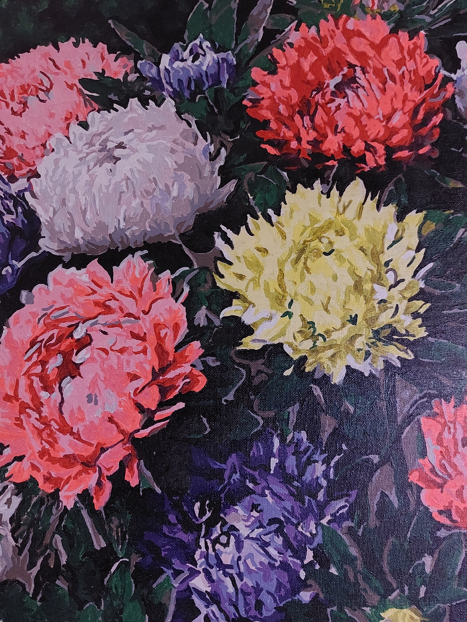 The image is a close-up of a painting of several chrysanthemums. The chrysanthemums are of various colors: red, yellow, pink, white and purple. The background is dark. The painting is likely done on c…read more
