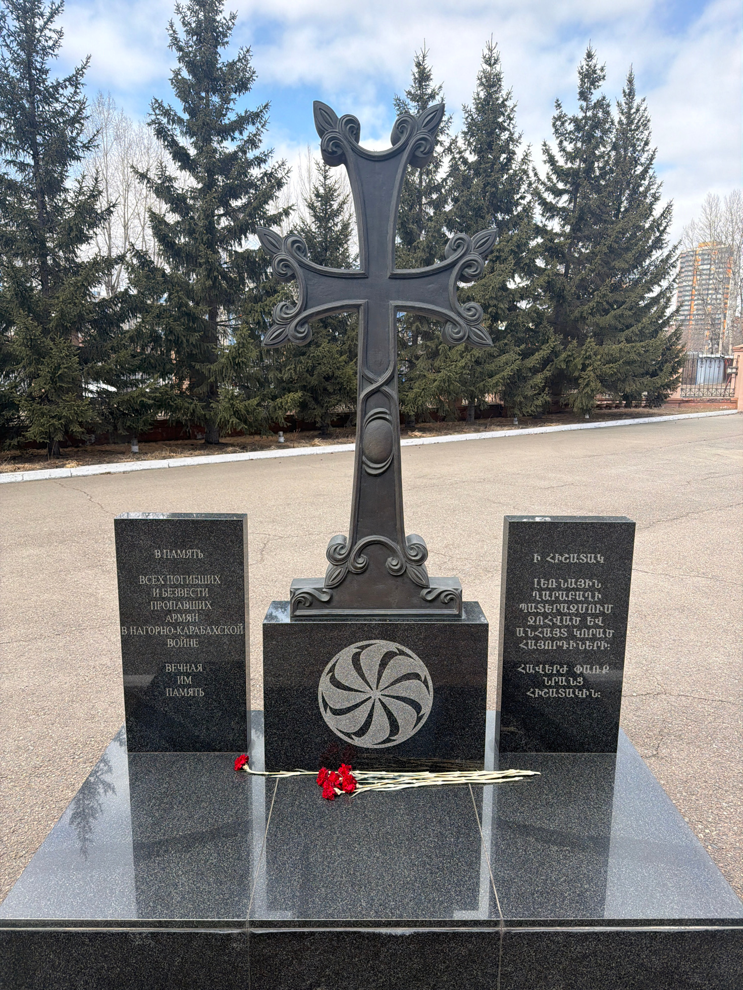 The image displays a solemn outdoor memorial located in Krasnoyarsk, Russia, dedicated to Armenians who perished or went missing during the Nagorno-Karabakh War. Central to the memorial is a tall, da…read more