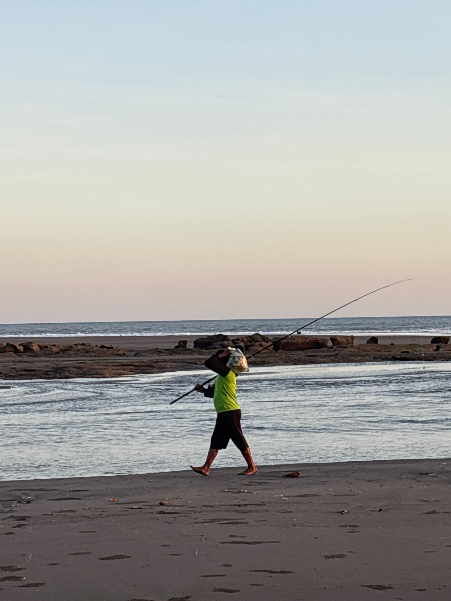 A man is fishing on a beach in Kerambitan, Indonesia. He is wearing a light green shirt and dark shorts and is standing on the dark sand near the water. He holds a fishing rod that is angled upwards t…read more