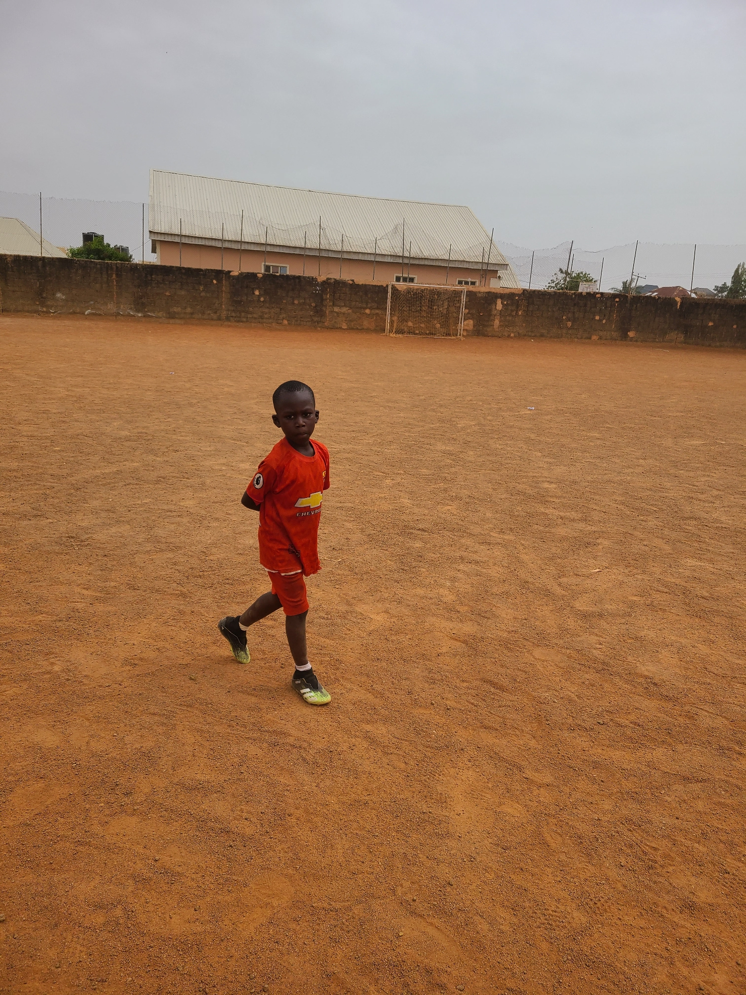 A young boy wearing a red soccer uniform and black and neon green cleats stands on a dirt field. He is facing the camera and looks to be in his early teens. Behind him is a building with a light-color…read more